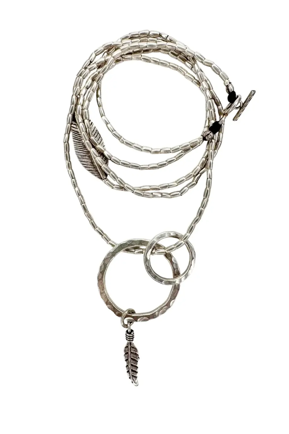 Simply beautiful, this pure silver necklace represents 2 souls uniting as one. It features a large and small pure silver ring floating on the classic RICO pure silver chain with a single feather dangling. Extending along the chain is a large silver leaf. The feather can represent a child coming into the world.