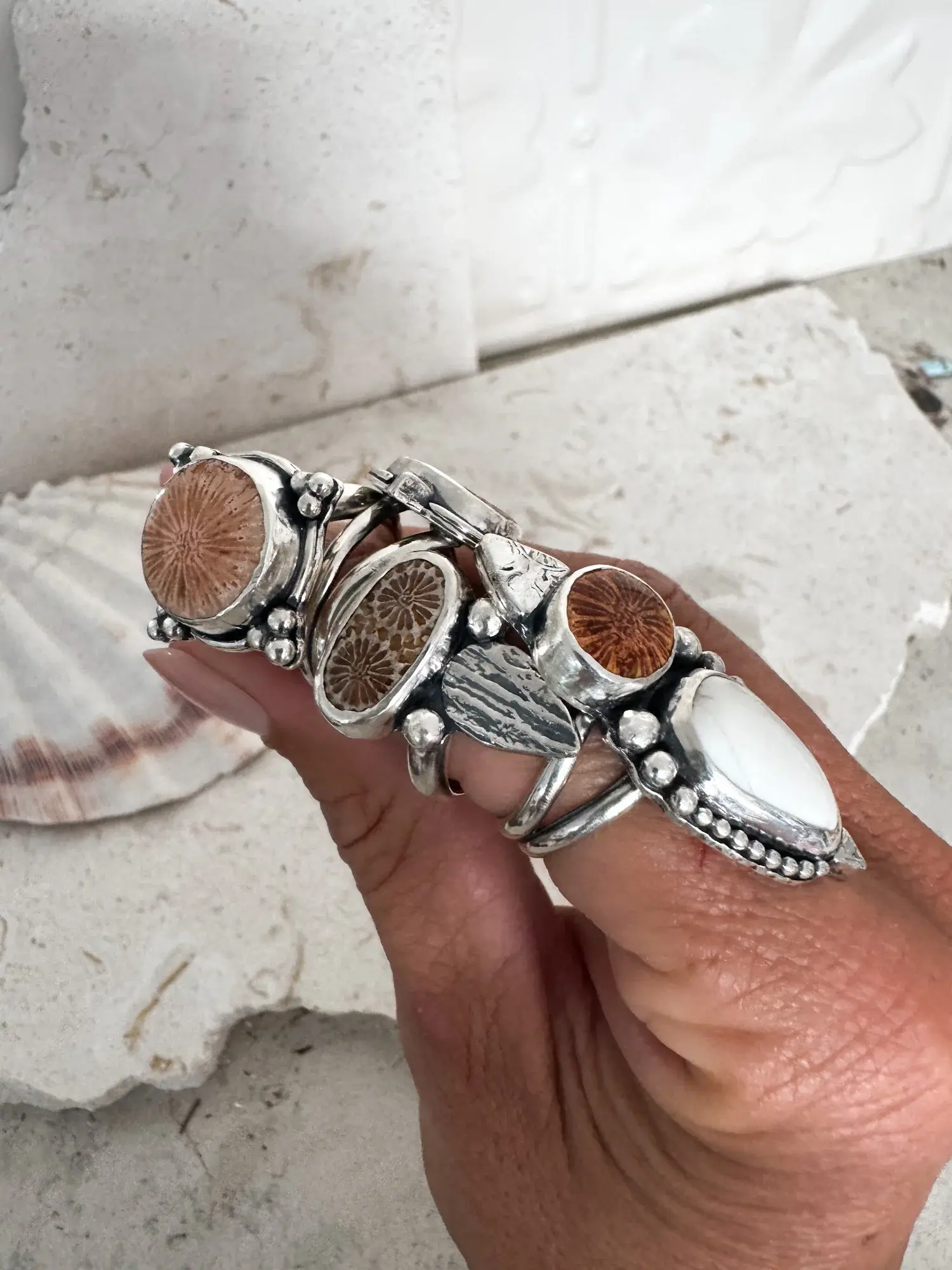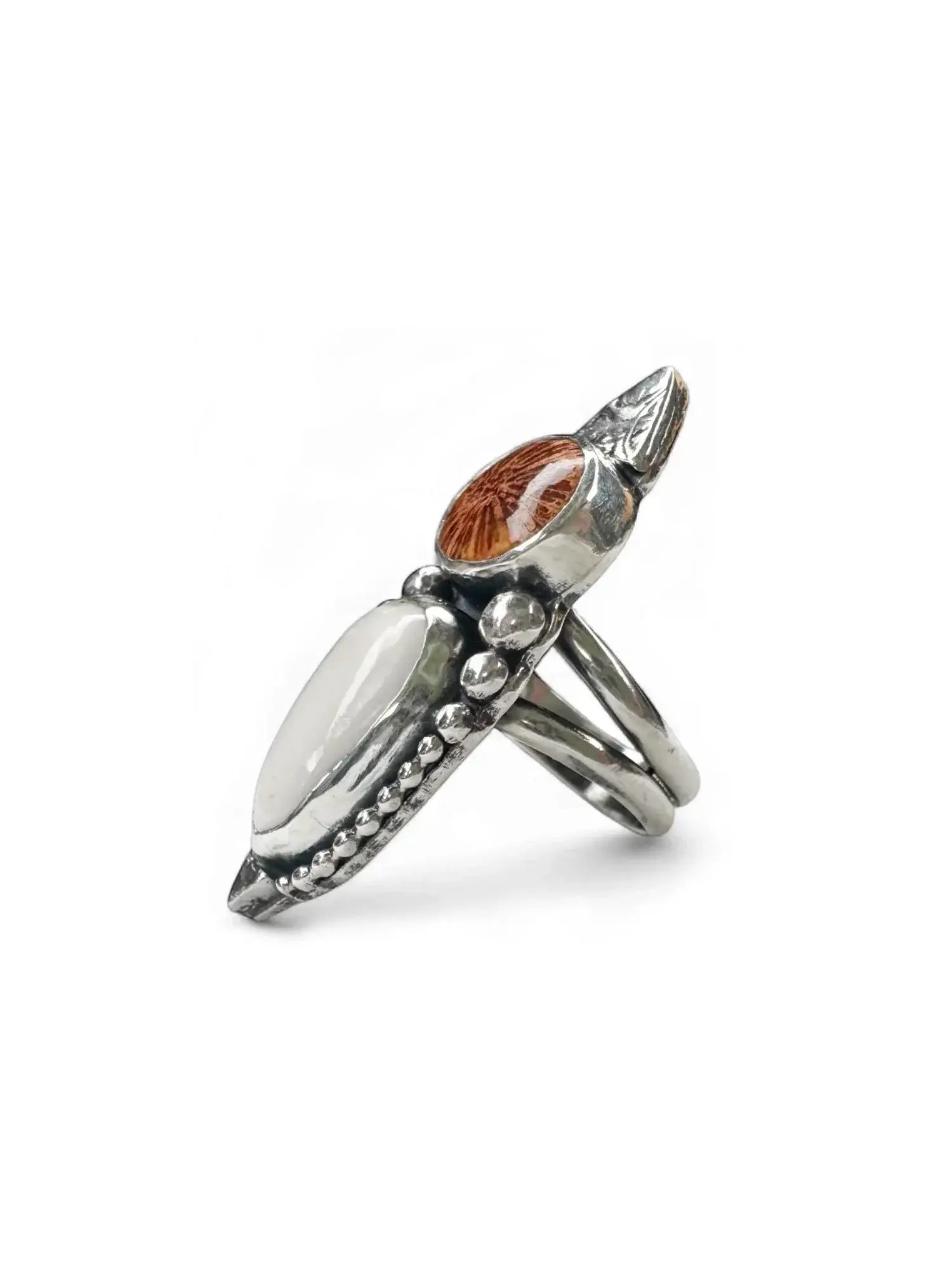 Crafted just for you, this one-of-a-kind silver ring brings together earth’s ancient treasures in a piece that feels both grounded and otherworldly. At its heart lies a stunning fossilised shell, rich in warm, earthy tones and natural patterns etched by time. Beside it, a milky teardrop of White Buffalo Turquoise offers contrast and calm — a grounding stone said to bring clarity and strength.