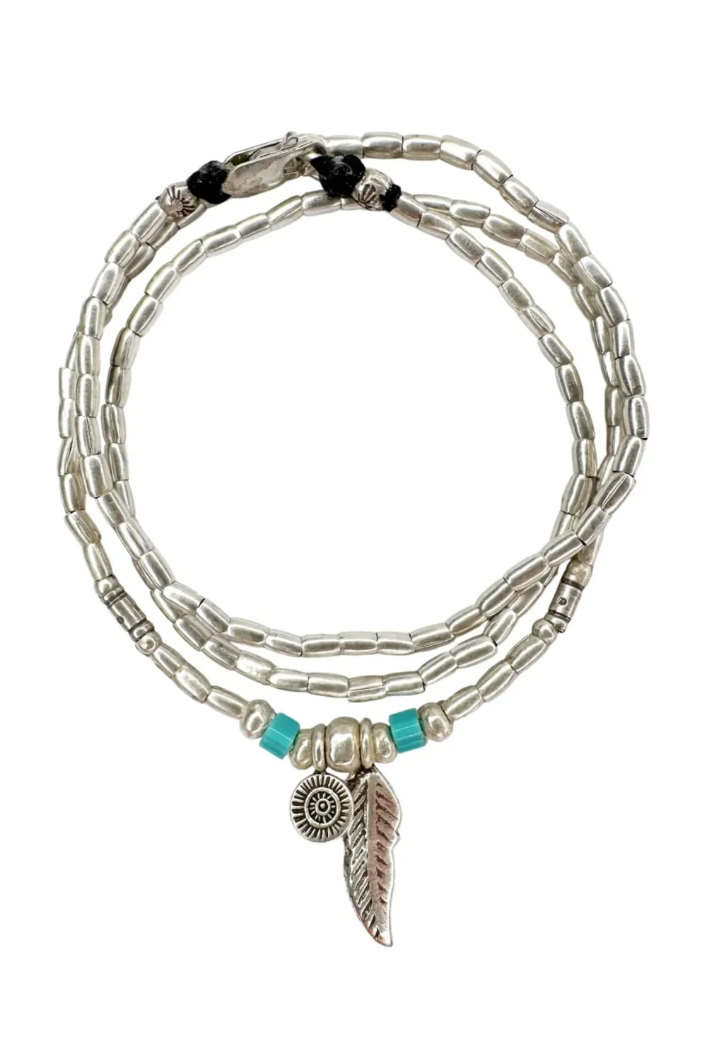 Pure silver wrap with Central feather and small sun pendant enclosed by 2 small turquoise colour seed beads. Wear as a triple wrap bracelet, a double anklet or a necklace. The choice is yours.