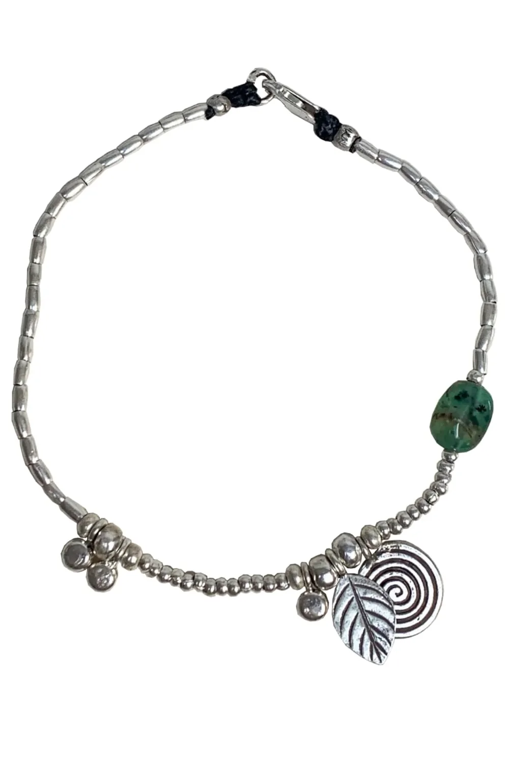 A stunning pure silver anklet with a pop of green Chrysoprase along side intricate silver embellishments. Wear this beauty in the shower or frolicking in the ocean… Please note that due to the natural nature of gemstones the chrysoprase stone will vary greatly between a light milky green to a darker green and can have brown to black markings/sections.