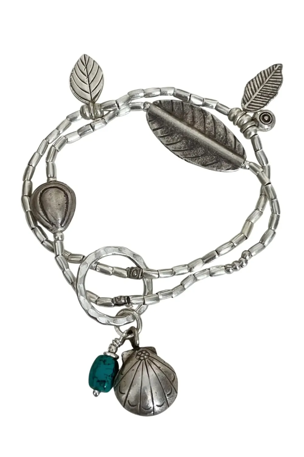 Pure silver strong stretch bracelet with a mixture of pure silver charms including shells, leaves and a turquoise + clam shell tassel.