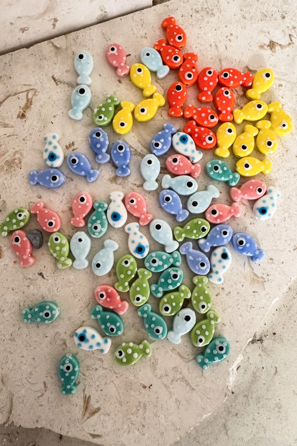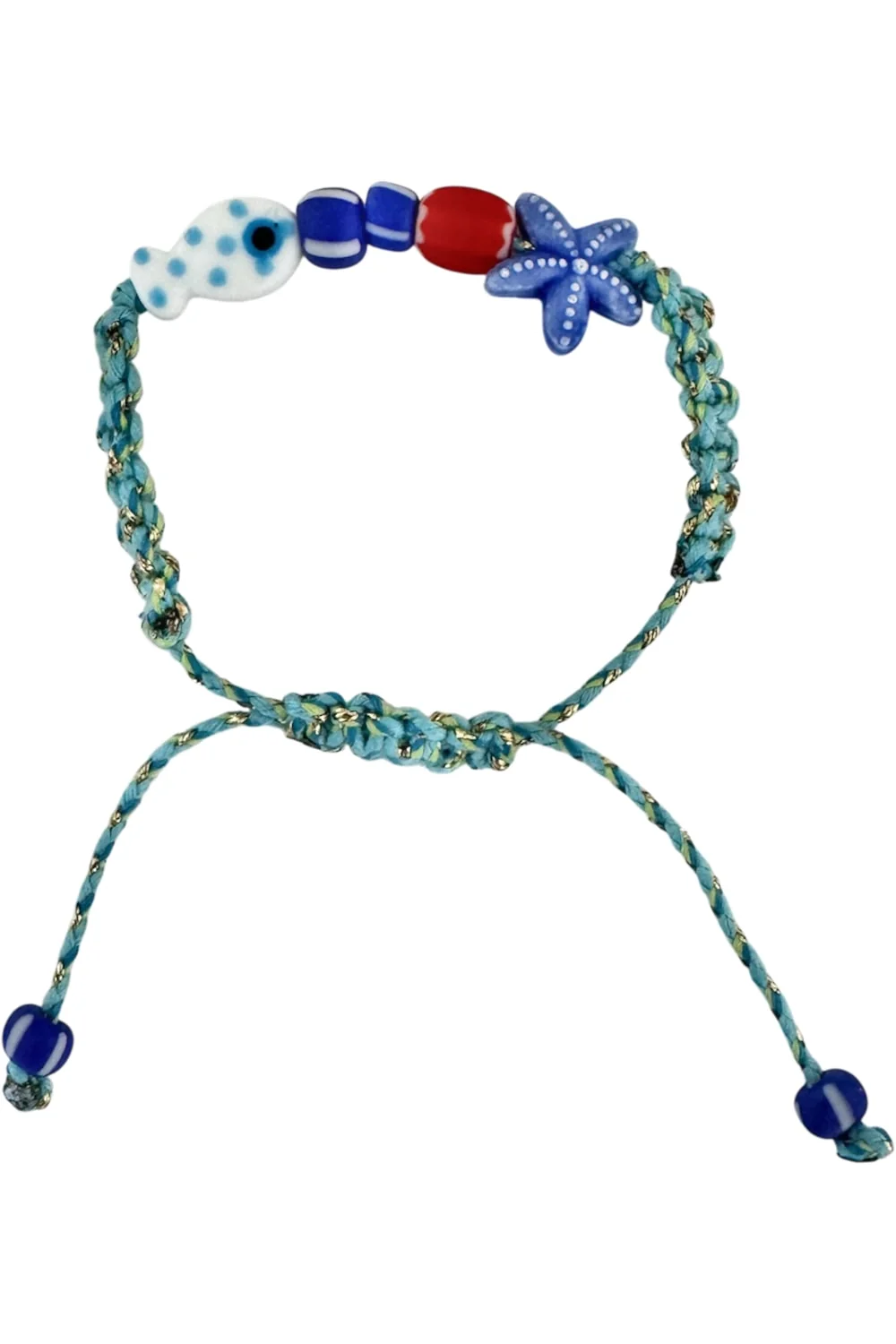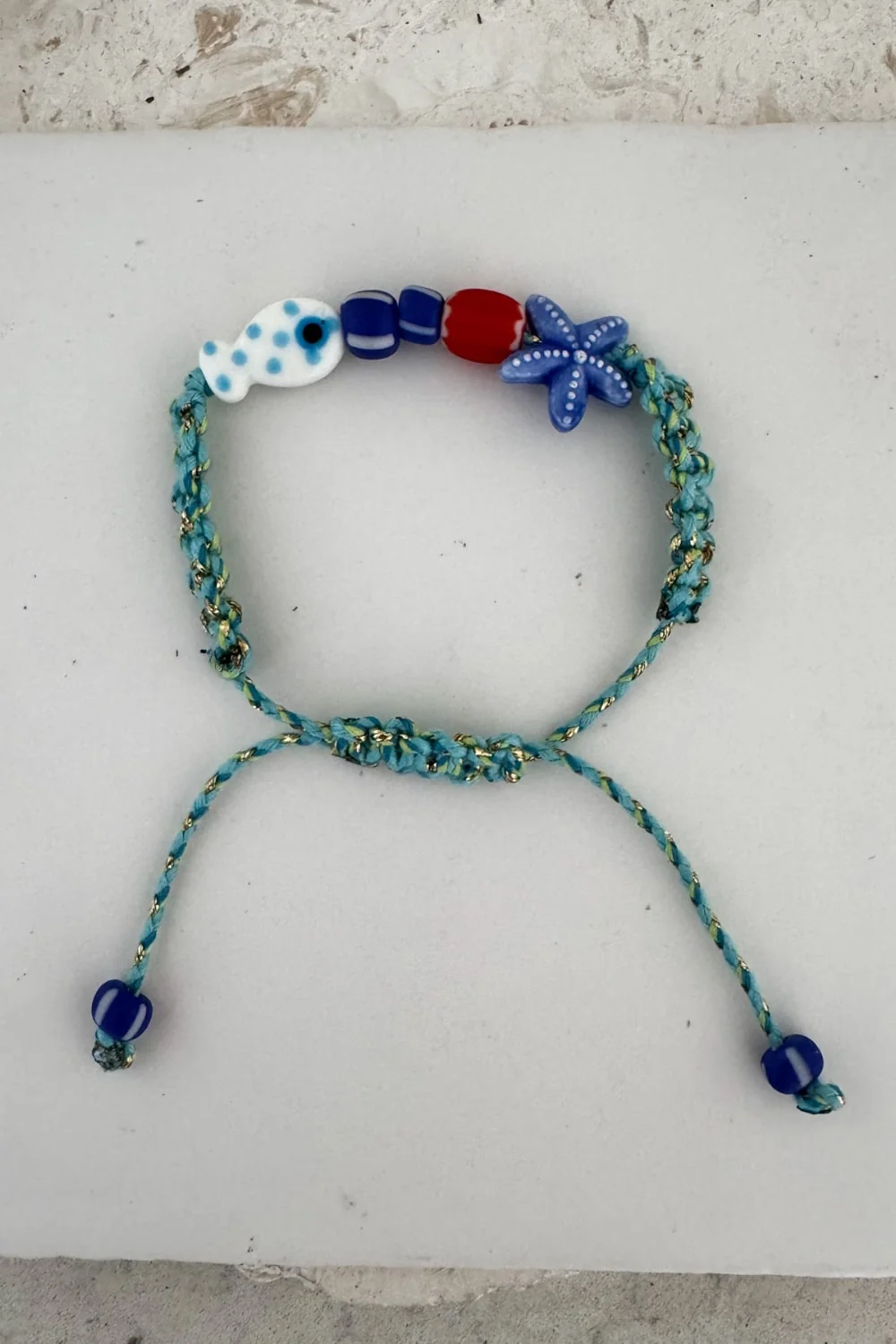 Bring a splash of playful colour to your everyday style with this fun, adjustable bracelet. Featuring a handmade ceramic fish and starfish bead, this piece is perfect for anyone who loves the ocean and wants to carry a touch of beach vibes wherever they go.