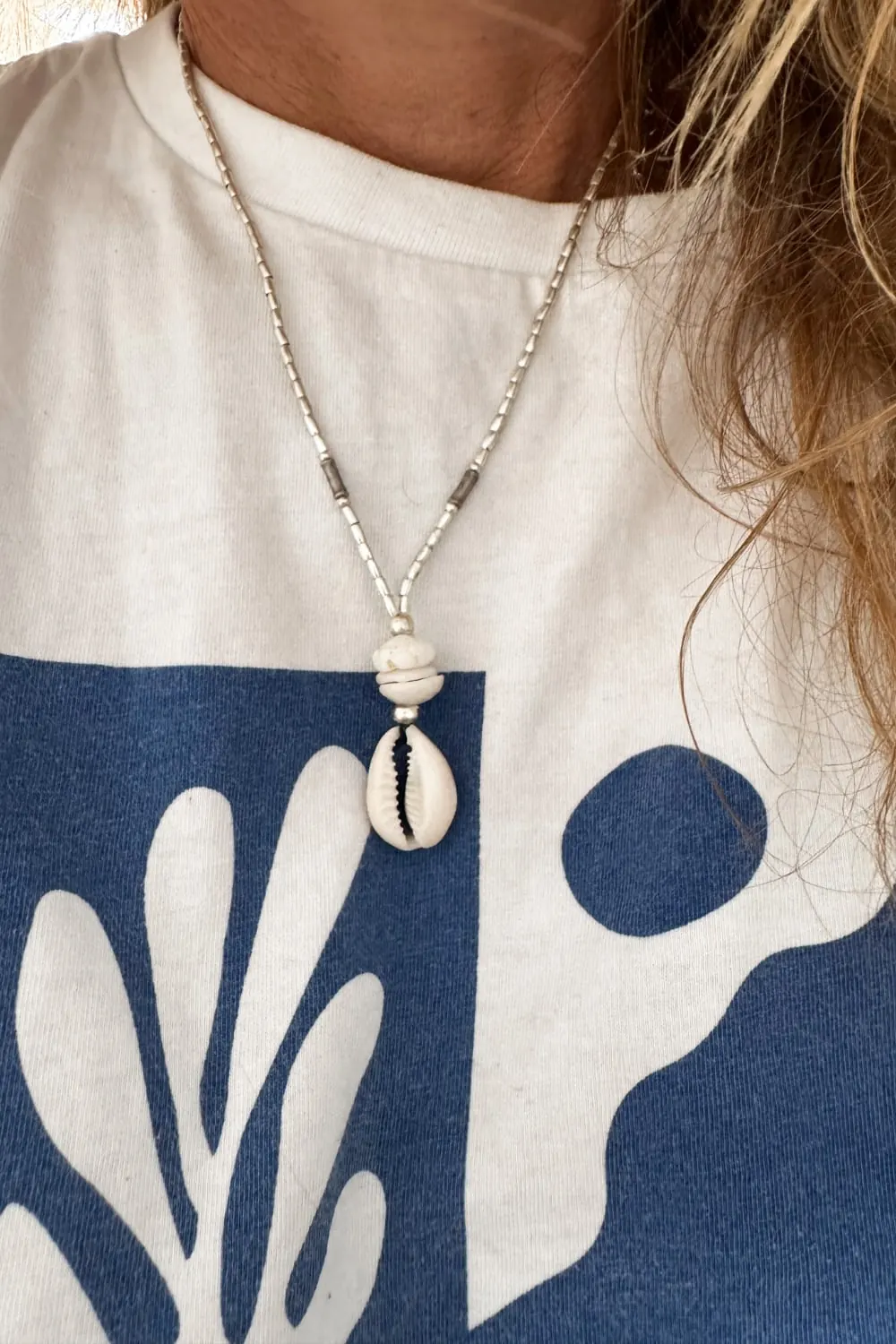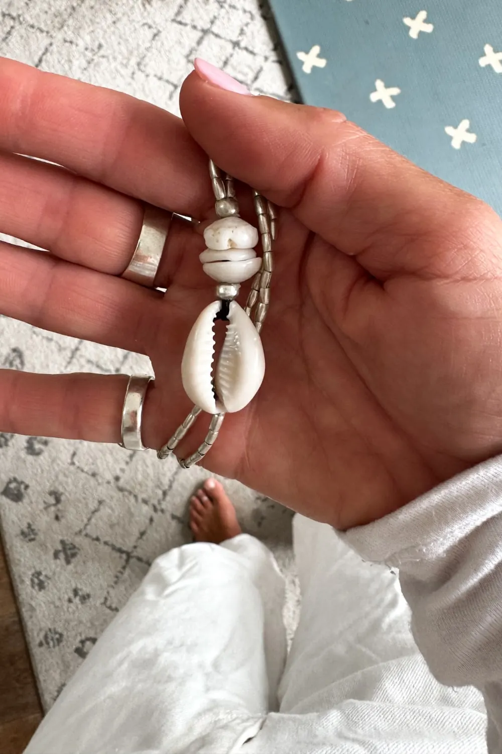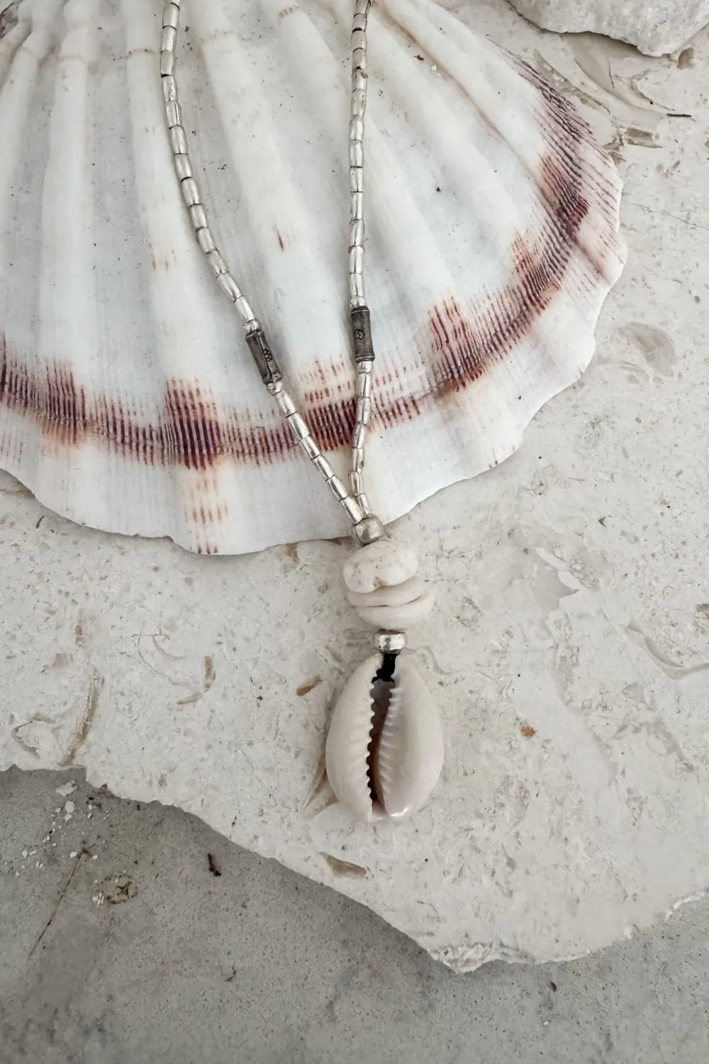 A beautiful beach inspired pure silver necklace. Featuring a natural Cowrie Shell extending into natural Puri Shells. This is a beach babe that you need to get your hands on. Set on the classic pure silver Rico seed chain, what’s not to love about this ocean safe medium length necklace.