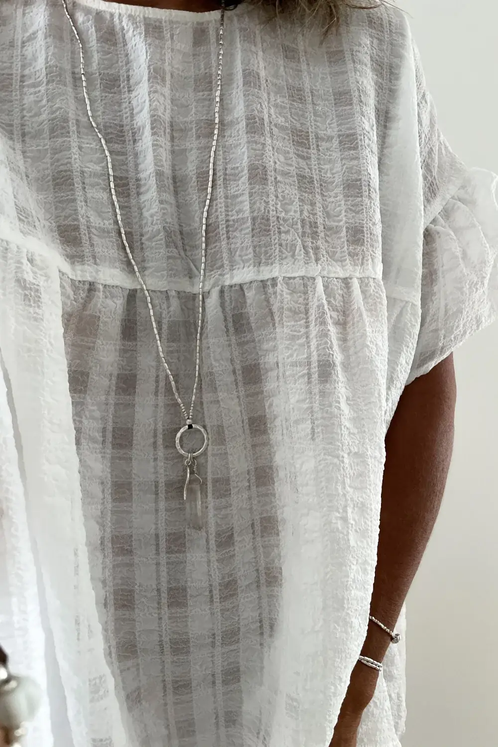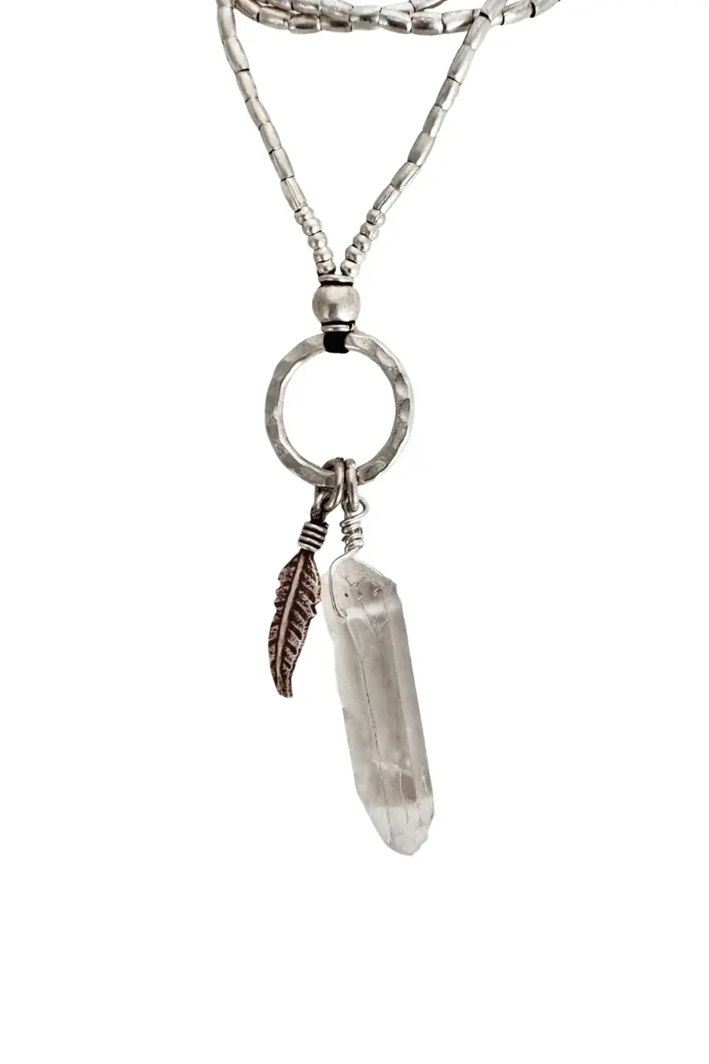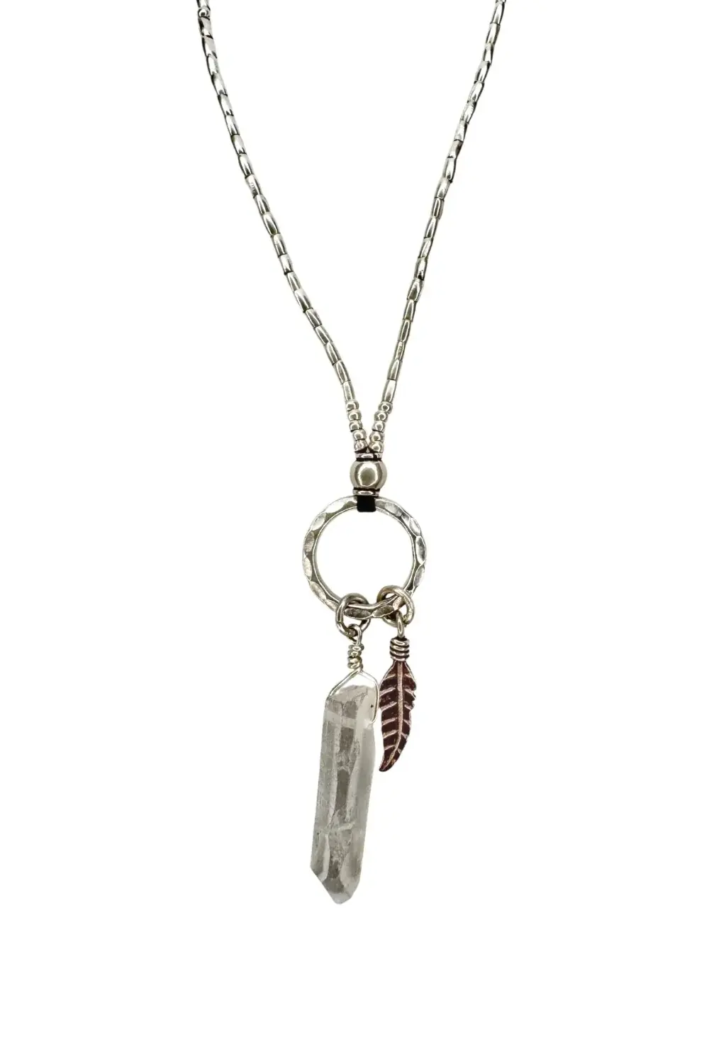 A classic Rico Designs necklace featuring a natural Crystal Quartz wrapped in sterling silver, teamed with a large pure silver leaf and silver ring and floating on the classic pure silver RICO seed chain. Connection is via a sterling silver parrot clasp with 2 link pure silver extension chain and RICO quality tag. Necklace styled in the images is a long length.