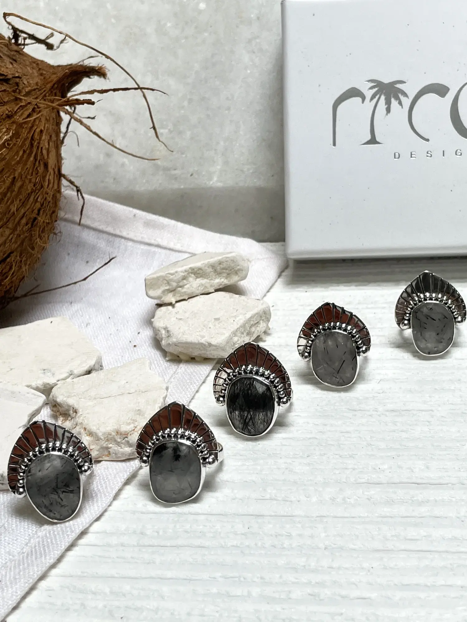 ***Please note that due to the nature of natural gemstones, the Rutilated Quartz will vary greatly in size, shape, markings and colour. The colour will vary between white/grey to grey/black to black and anything in between. Every single ring in this collection are unique, no two are the same, making your ring one of a kind.