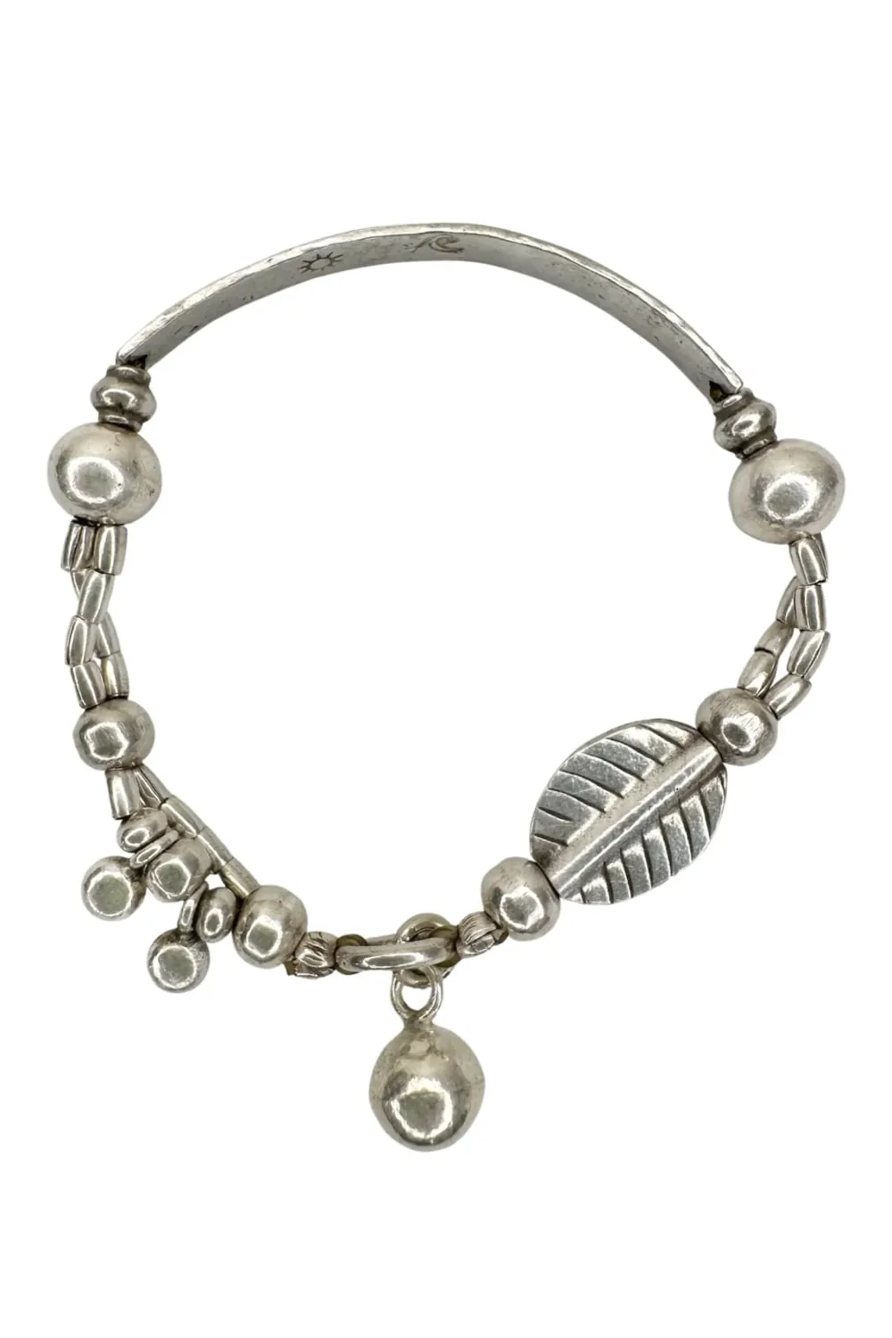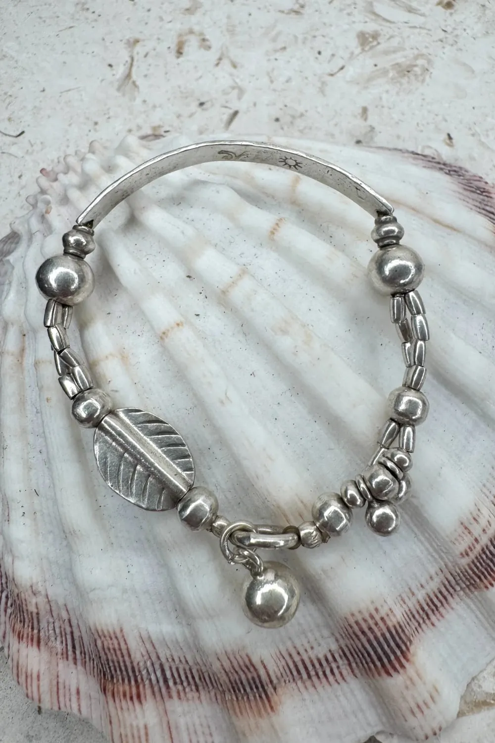 The hammered bar is set amongst pure silver strands and features a medium silver leaf and balls. This is a strong stretch bracelet with a small tassel pendant. Please note that tassel may vary depending on availability.