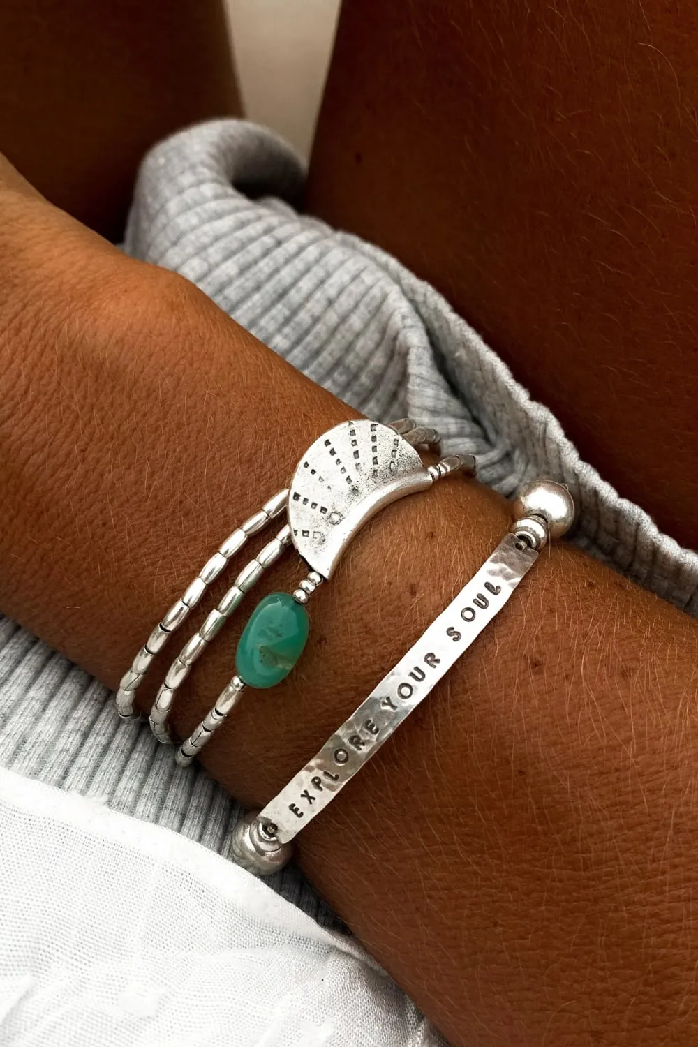 A customisable bracelet to add to the Rico mix. The Explore Your Soul Bracelet features a hand stamped and hammered flat sterling silver bar with option to add the text/message/quote of your choice. Product image displays ‘EXPLORE YOUR SOUL’. Type your desired text into the add on section or choose to leave blank to receive a blank bar.