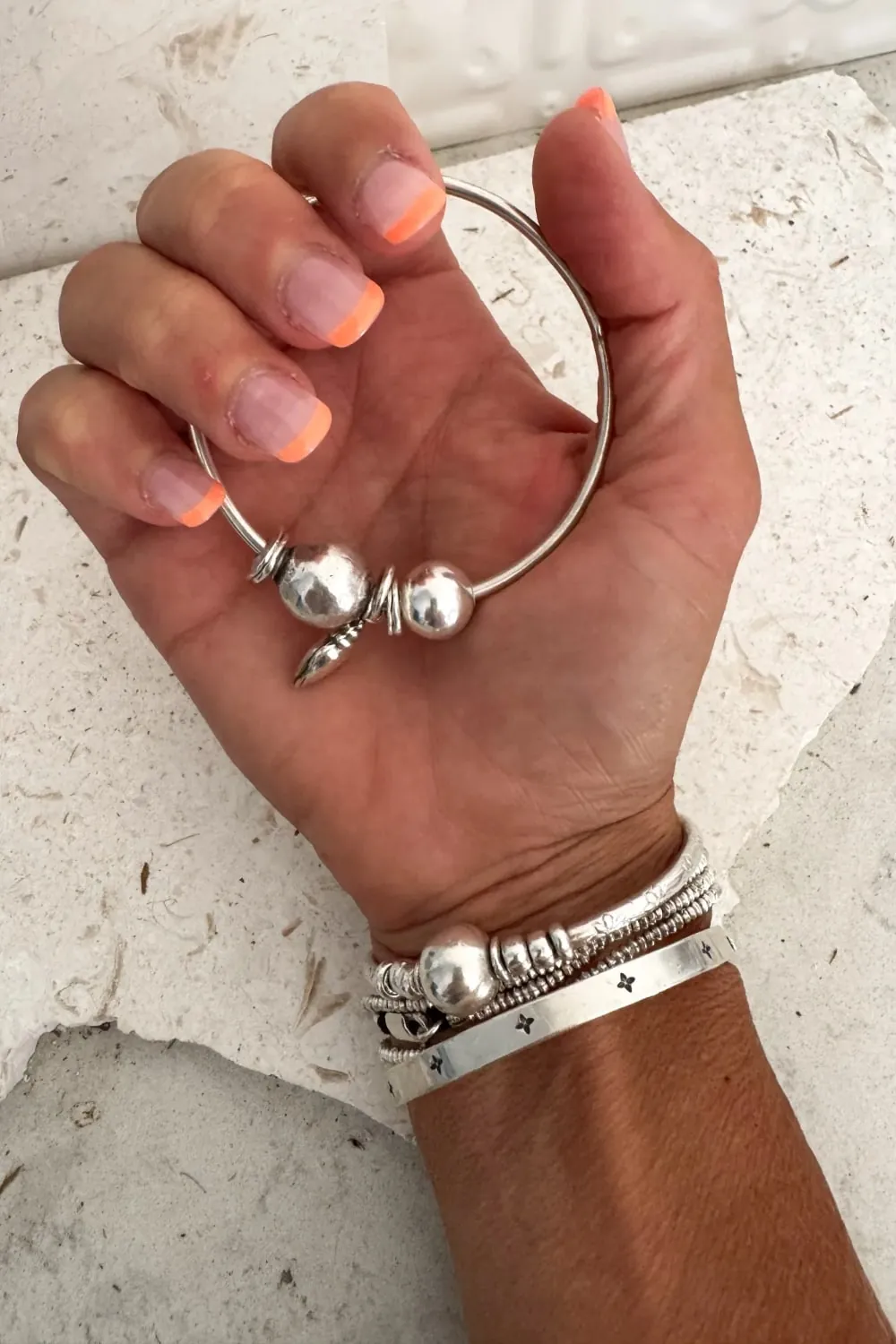 This handmade sterling silver bangle features a solid 2.5 mm round wire design, accented with varying size pure silver ball beads, and shell charm. Separating these beaded details a free from water cast beads. Each one is unique in its form and size. The subtle details offer a clean, modern look with a touch of personality. Perfect for everyday wear or as a simple statement piece.
