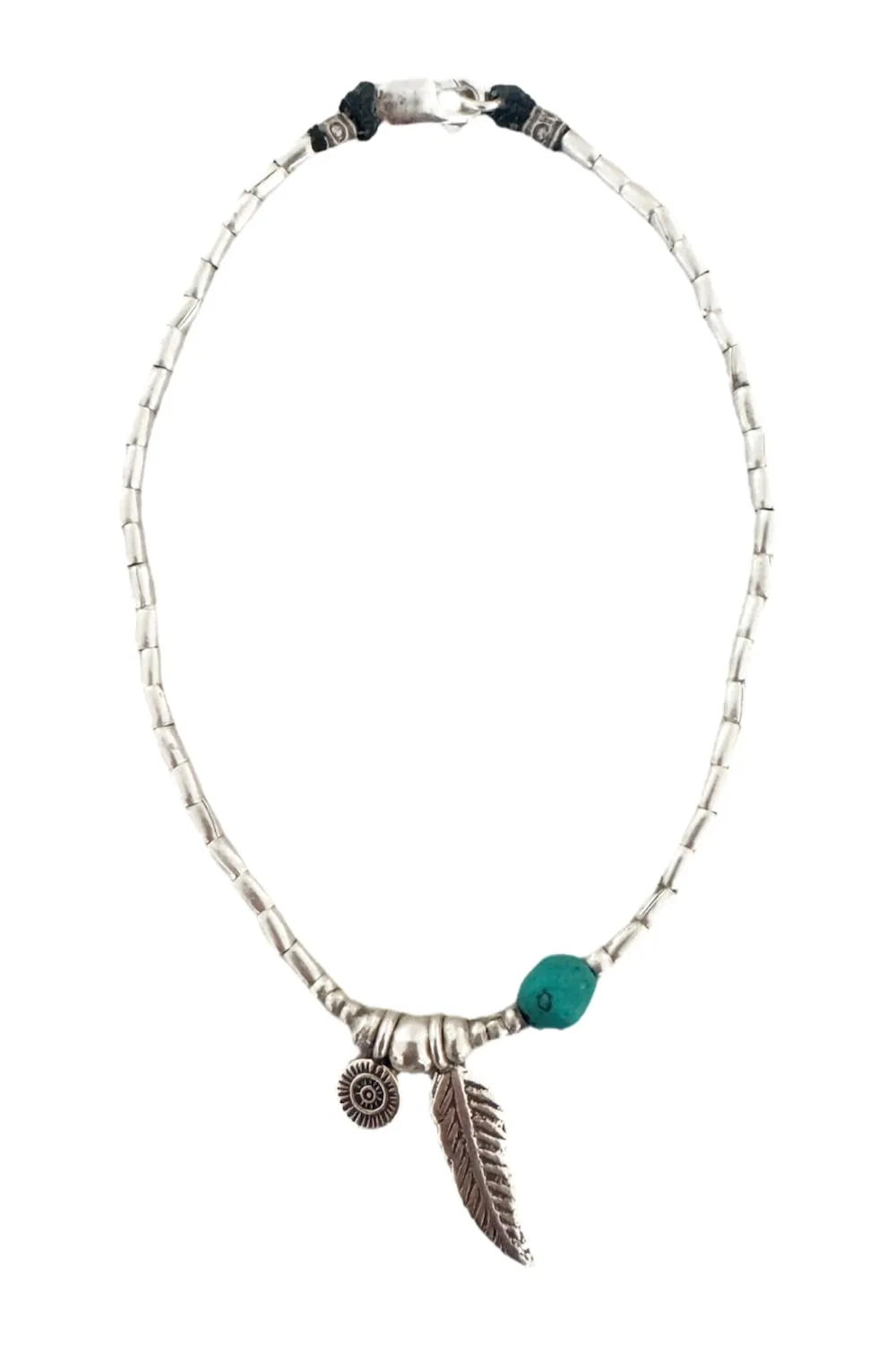 Pure silver anklet featuring a central silver feather, sun pendant and small gemstone. Turquoise is featured in images. Select the gemstone you desire from the drop down menu. (Larimar- light blue, pink tourmaline, black tourmaline, green amazonite). Please select ONE gemstone below using the check box. If stone is not displaying, this means it is sold out.