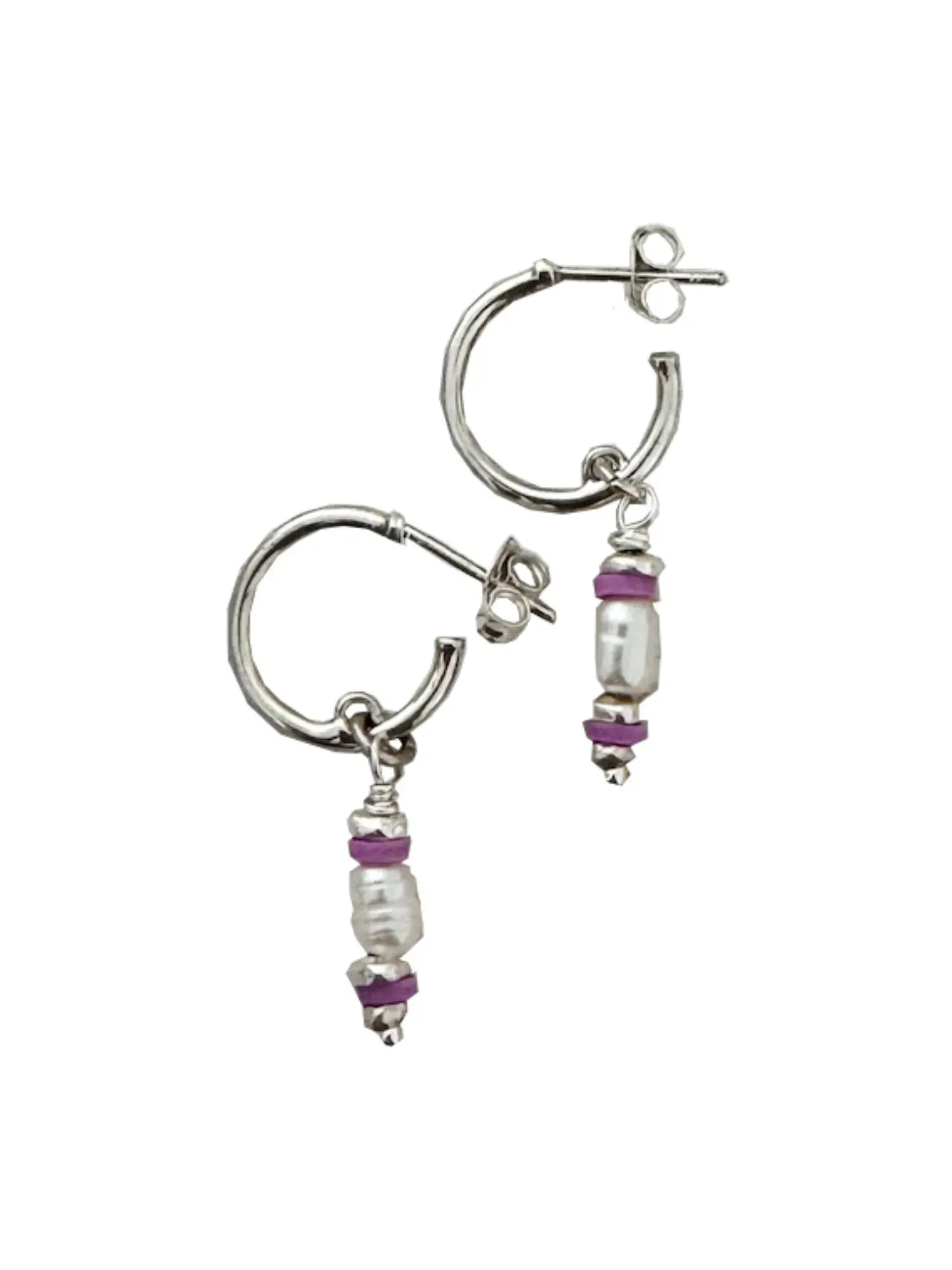 Sterling silver half hoop stud earrings. (Sold as a pair). They feature a small cultured freshwater pearl with a small disc pop of colour. They look great worn solo or stacked. Select your desired colour and hoop size from the dropdown menu.