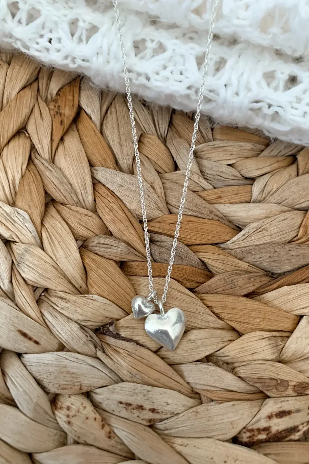 Bright Sterling Silver 1.3mm Double Rope Chain. This is a strong, yet elegant-looking chain teamed with 2 pure silver hearts. One big and one small representing the uniting hearts of mother and child.