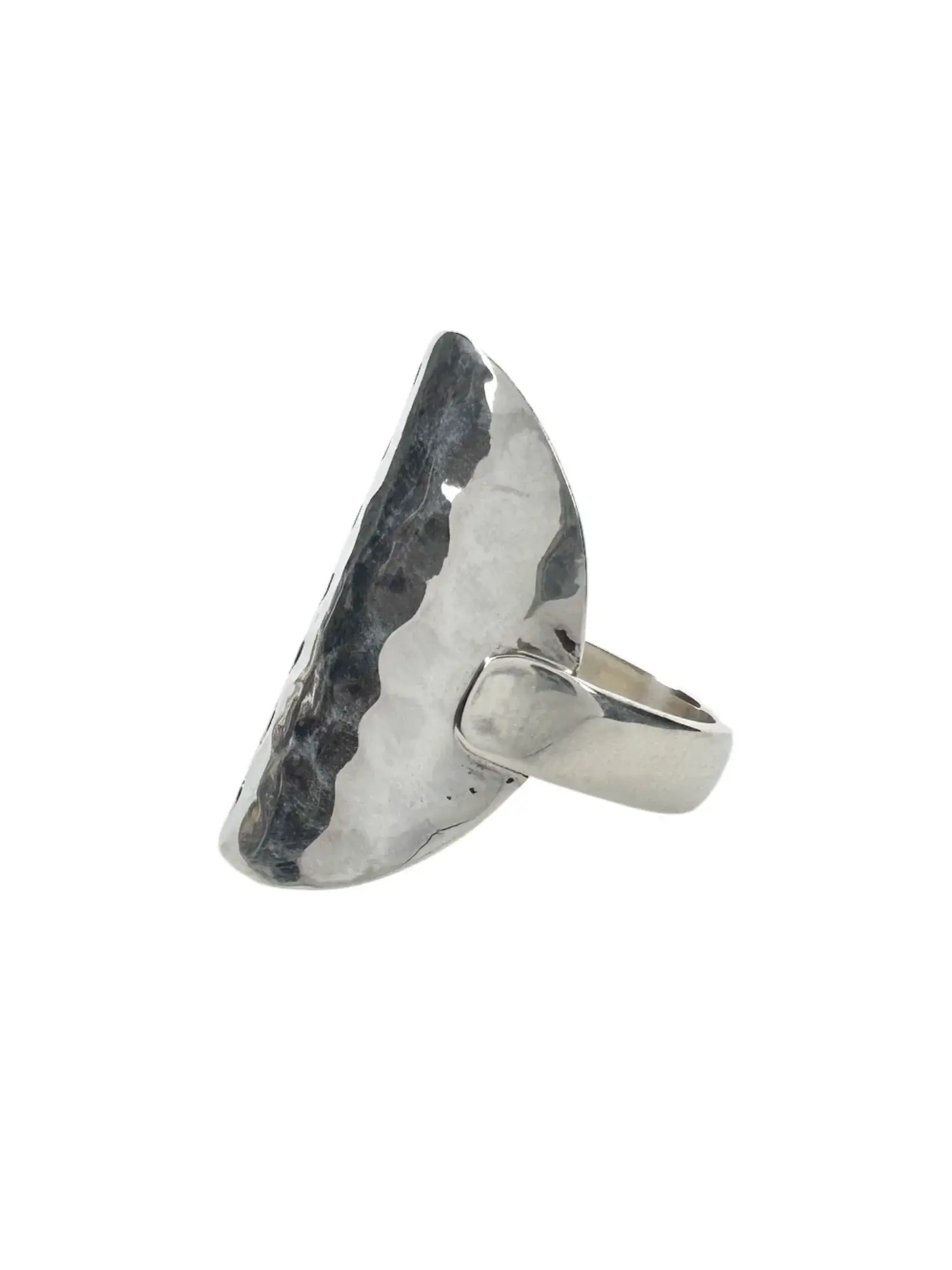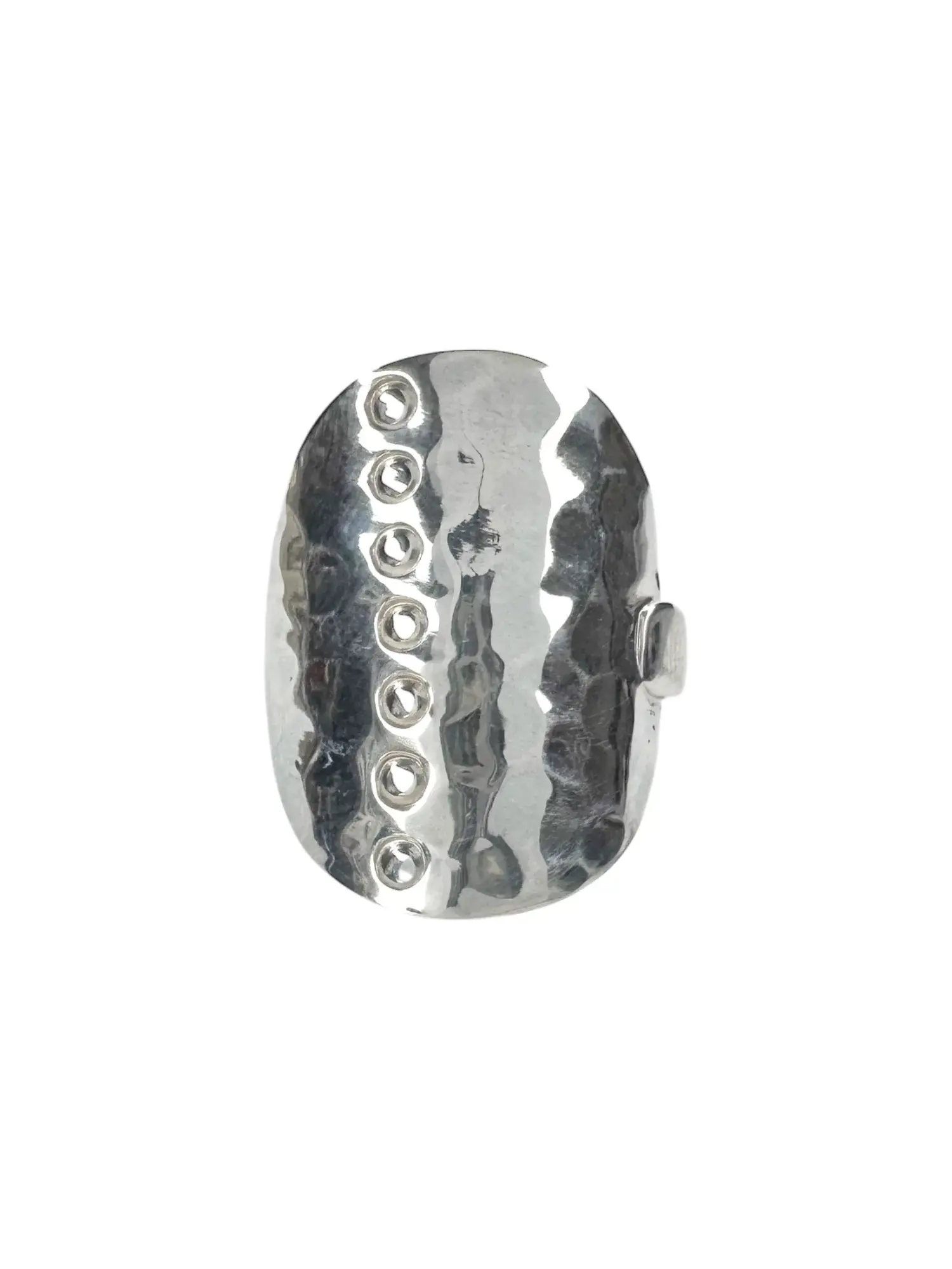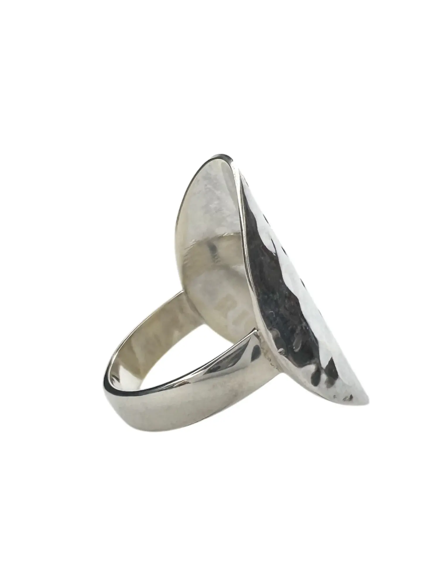 An eye catching large sterling silver disc ring. The silver disc wraps with the curve of the finger. With a lightly hammered surface and a line of hammered circles, this beauty is sure to catch the attention of others. The large disc ring has a thicker style band with one side extending under the disc and the other side extending over the top of the disc.