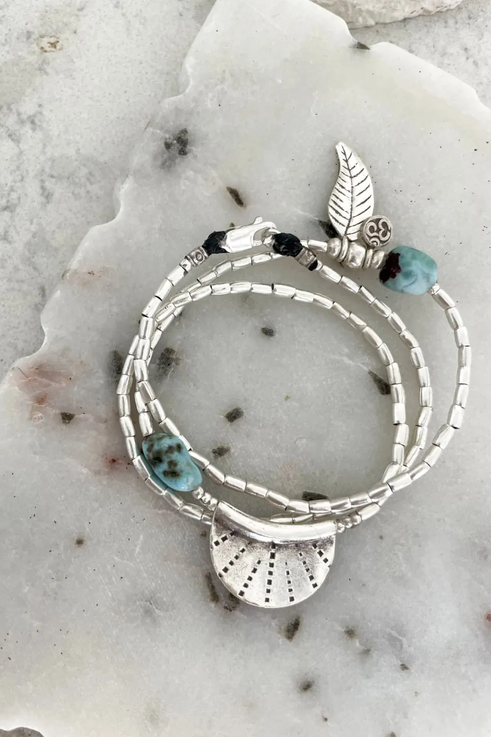Truely a stunning wrap, it features 2 Larimar nugget gemstones, a pure silver crescent centre and leaf/Om pendant. Please note that due to the natural nature of gemstones, the size and colour of each Larimar stone will vary greatly. Some will have more black markings.