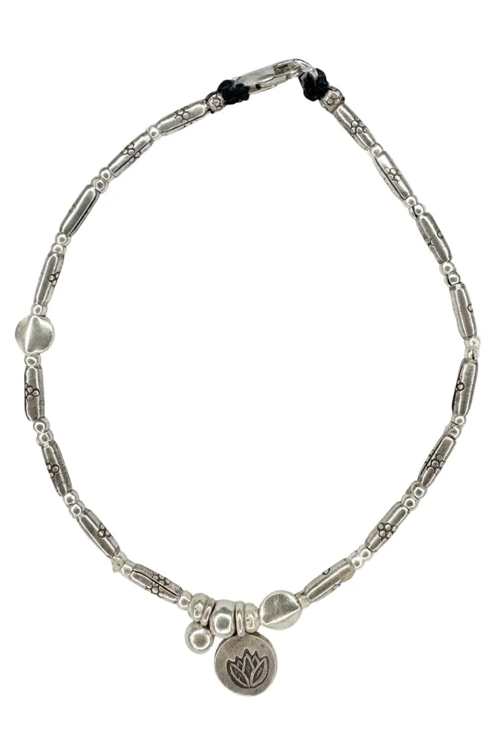 Pure silver anklet featuring a long style silver beads and a central silver lotus flower charm.