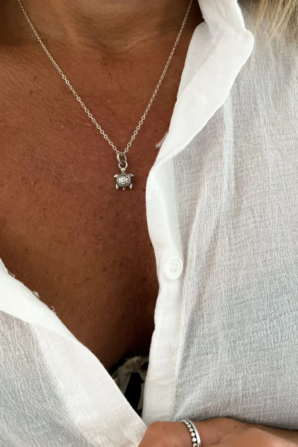 A very cute tiny sterling silver turtle pendant strung on a fine 1.6 mm sterling silver cable chain.