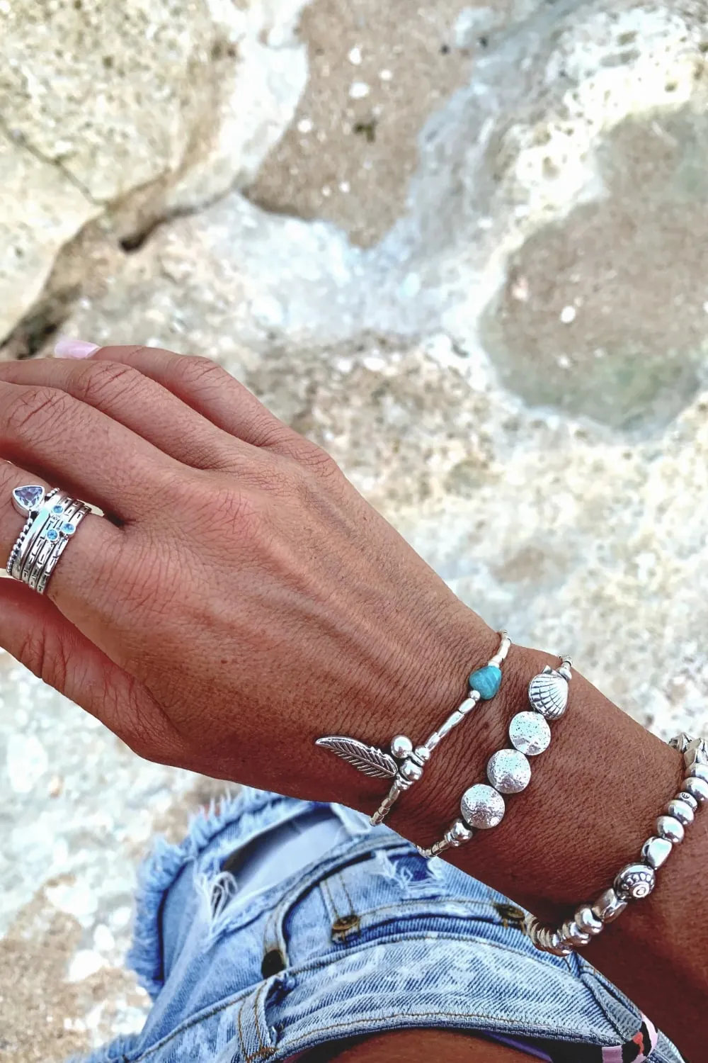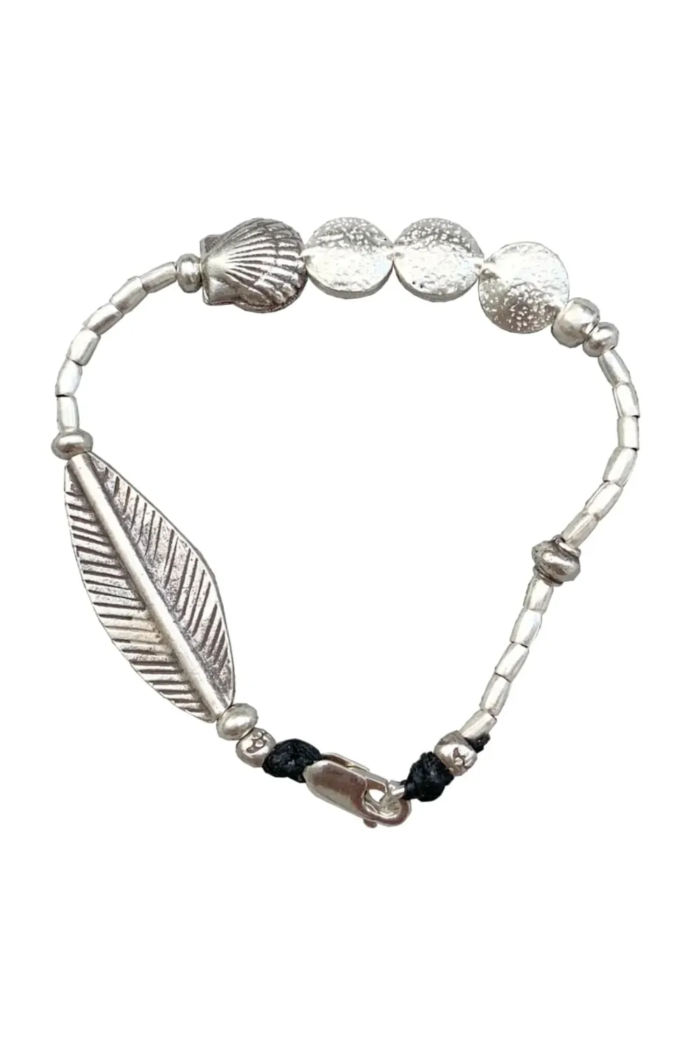 A beautiful pure silver bracelet featuring a large silver leaf, silver clam shell and 3 flat textured silver discs. Connection is via a sterling silver parrot clasp. Please note that this bracelet does NOT come with the pure silver extension chain unless selected as an add on. If not adding chain extension, please consider sizing up to make room for the large leaf detail.