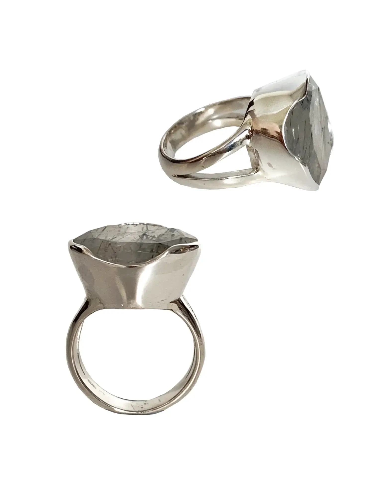 An absolutely stunning ring, sterling silver teamed with faceted Rutilated Quartz. Every Moonlight Ring is difference from the next from shape, size and colour making your ring uniquely yours. This ring will come in a variant of greys to black from oval to rectangle. It sits high making it a great cocktail ring for that special occasion. Please check out product images to see a sample of the variations The Moonlight Ring can come in.