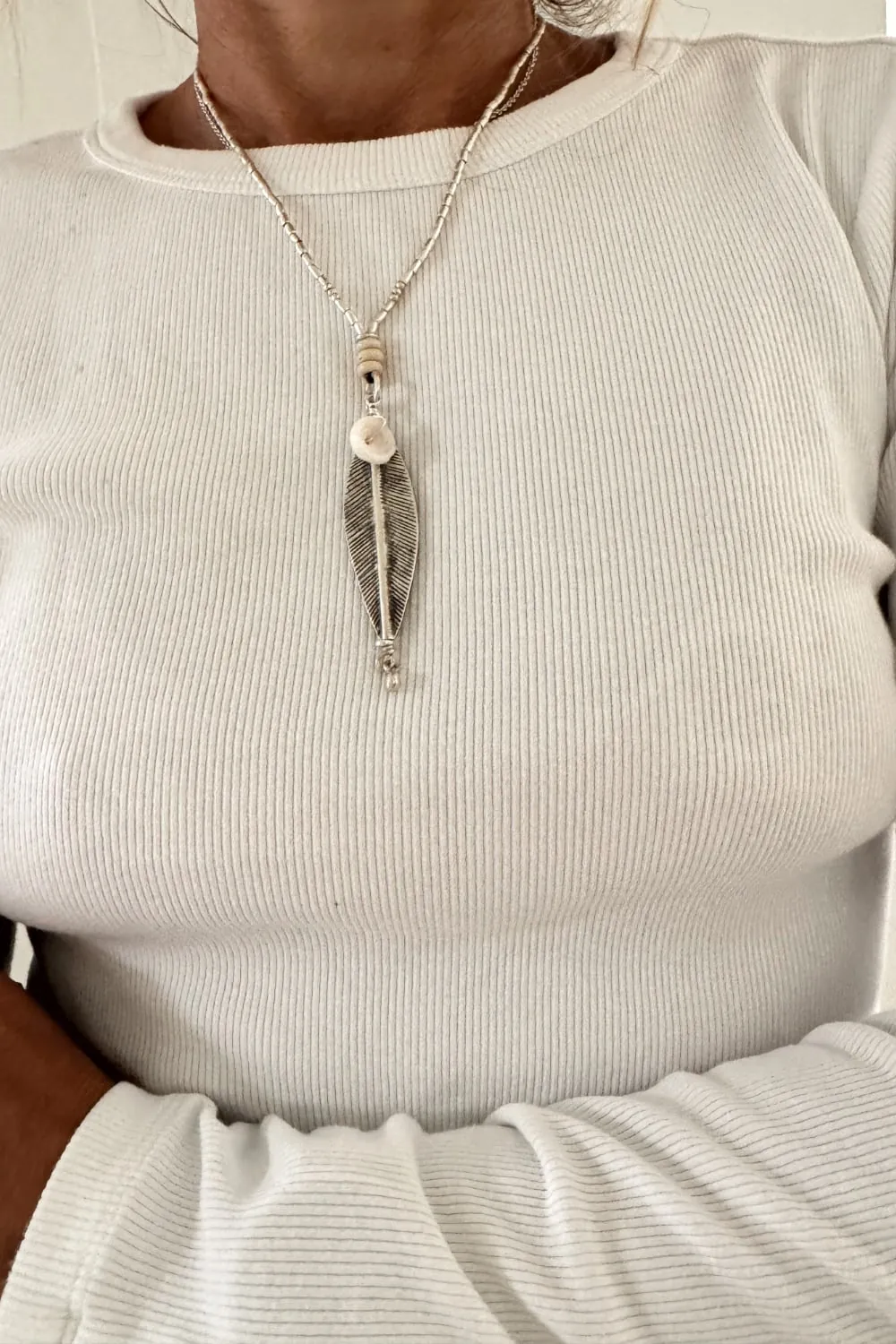 A stunning large pure silver leaf teamed with coconut coloured shells and a single silver wrapped natural puri shell charm. This necklace sit higher on the then extends into the leaf and shell feature. Strung on the classic Rico pure silver seed chain and connecting via a sterling silver parrot clasp. This necklace is a stand out and will add style to any outfit.