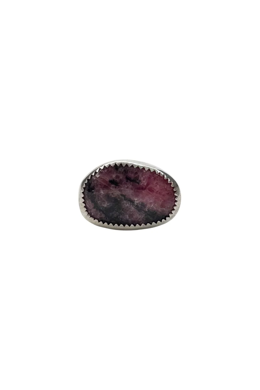 A stunning one off sterling silver ring. It features a beautiful free form natural Rhodonite Gemstone with a serrated edge bezel setting. The Rhodonite is set horizontally on a heavy gauge ring shank, with light hand stamped markings. Rhodonite symbolises compassion and love and is celebrated for its emotional and spiritual healing prowess. It is said that Rhodonite aids in overcoming emotional wounds, fostering unconditional love, and promoting mutual understanding in relationships.