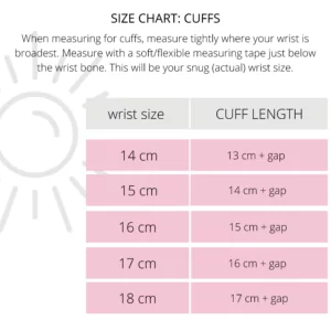 A note on sizing. How people like to wear their jewellery is a personal thing. I wear this cuff more loose. My wrist is 15 cm snug fit and the length of the cuff I wear is 15 cm plus it has a gap of about 2 to 2.5 cm (total outer circumference 17 to 17.5 cm). When selecting a size from the drop down menu, you are selecting the length your cuff will be made to (not your wrist size length).