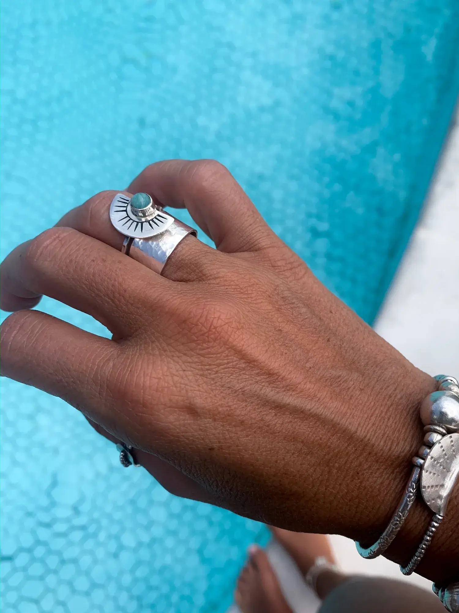 A beautiful Sterling silver ring featuring a silver crescent with small round Amazonite gemstone. This ring can be stacked up or worn solo. My fav combo is the sterling silver rising crescent ring teamed with the sterling silver bridges ring