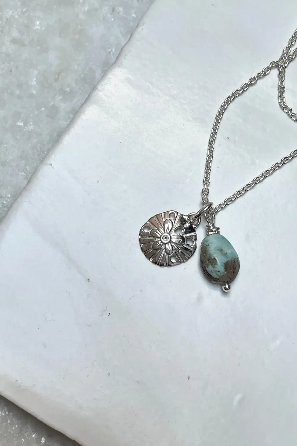 A beautiful sterling silver chain necklace featuring a sterling silver sand dollar pendant with light blue larimar stone. It is strung on a thick sterling silver curb chain. Please note that due to the nature of natural stones that size, shape, colour and marking will vary.