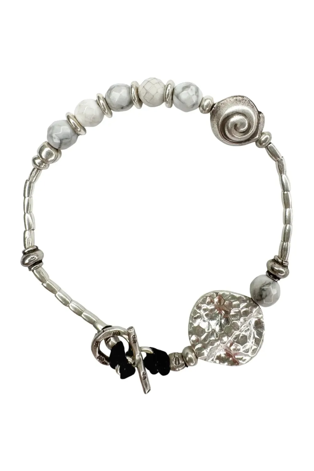 A twist on the old Sea Bliss Bracelet and the perfect bracelet for the beach bums at heart. Featuring pure silver components with faceted white agate stones, a large flat pure silver disc and silver spiral shell.