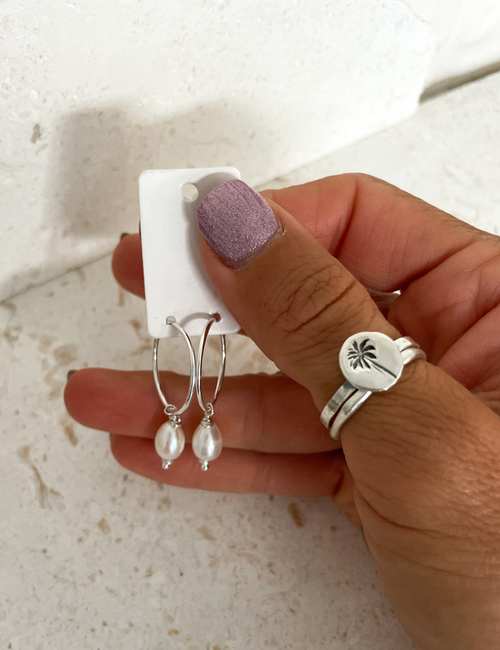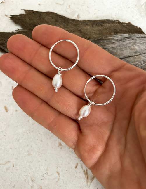 A minimal pair of earrings for that everyday look. A sterling silver infinity hoop with beautiful cultured natural pearl. Choose between 2 sizes; 24 mm (pictured) or 20 mm. Perfect for a paired back look or use them as layering pieces in an earring stack.