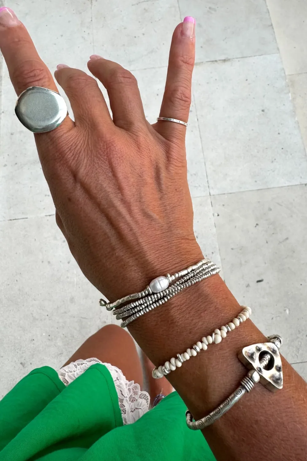 A simple pure silver Bracelet with a single cultured freshwater pearl at its centre. Wear it as a minimal style by itself, or add it to a bracelet stack.