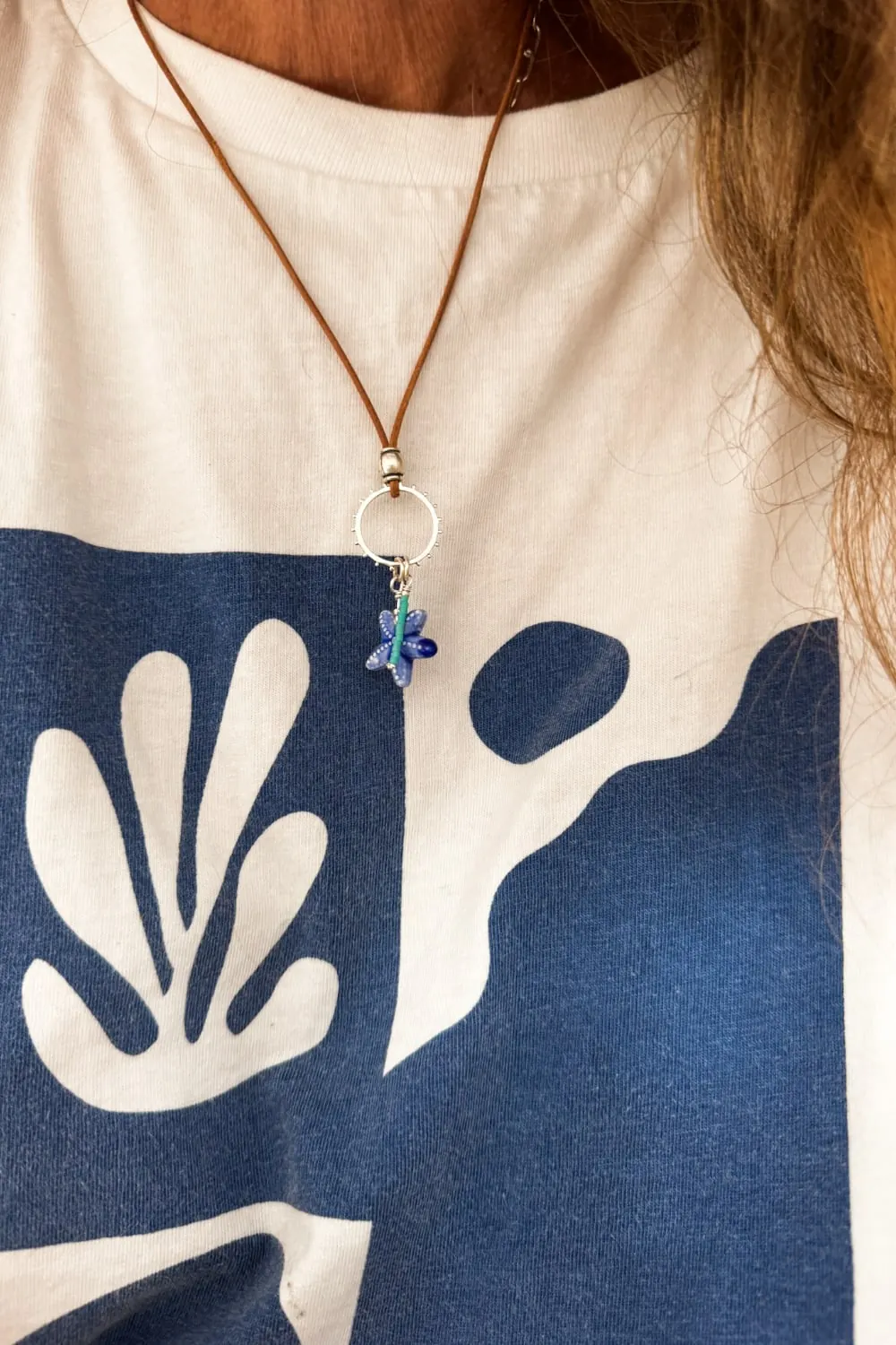 Throw this baby on to add that little something to your outfit. Featuring a beautiful sterling silver ring with silver dot detail. Hanging freely from the ring is a fun and colourful Starfish charm and seed bead bar charm. Customisable with the ability to choose your colour options of the star fish and the seed bead bar charm. The ring is set in place by a single pure silver bead and extends into a stunning natural soft round leather cord. What’s not to love about this beautiful boho style simple necklace.