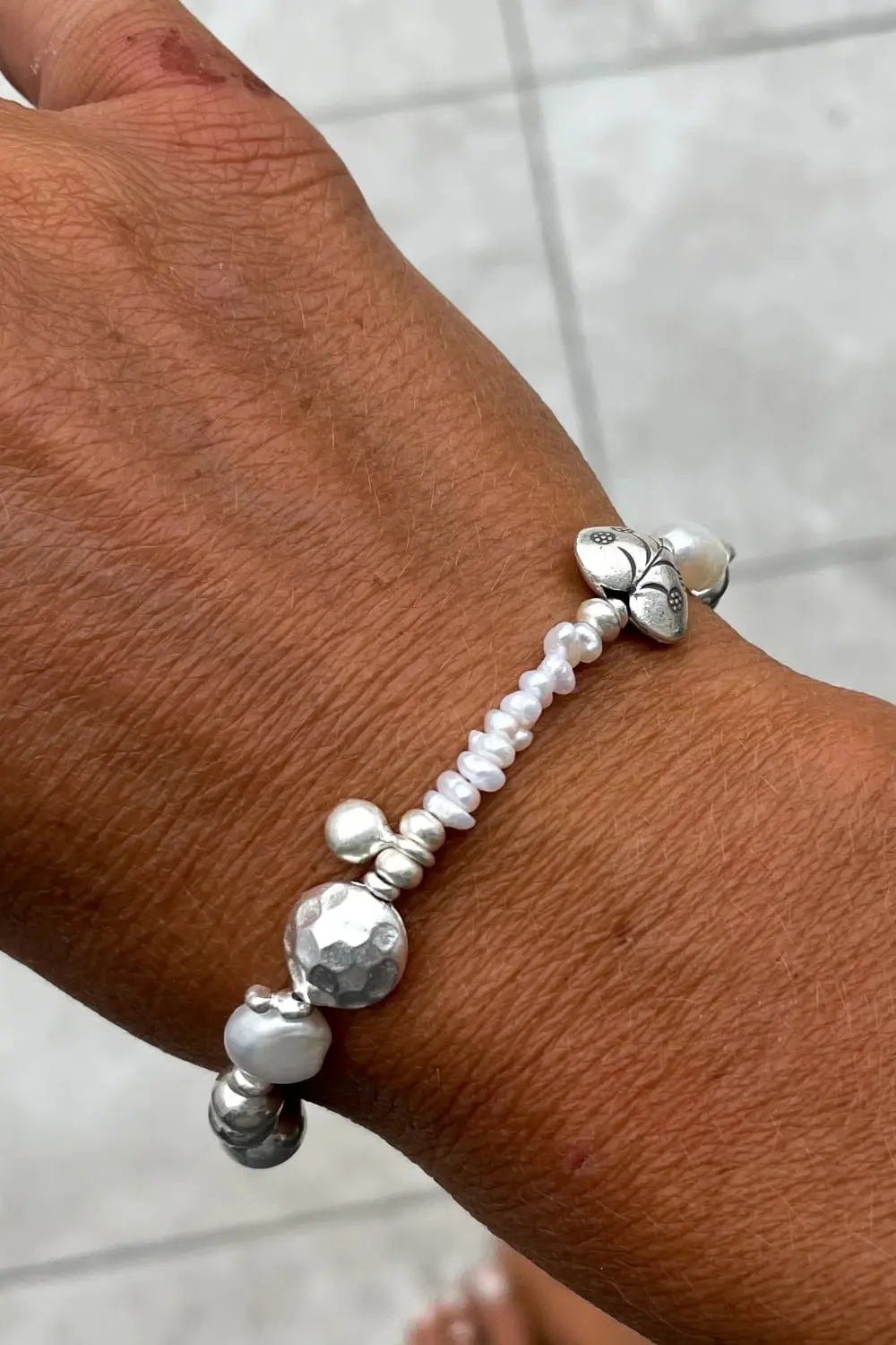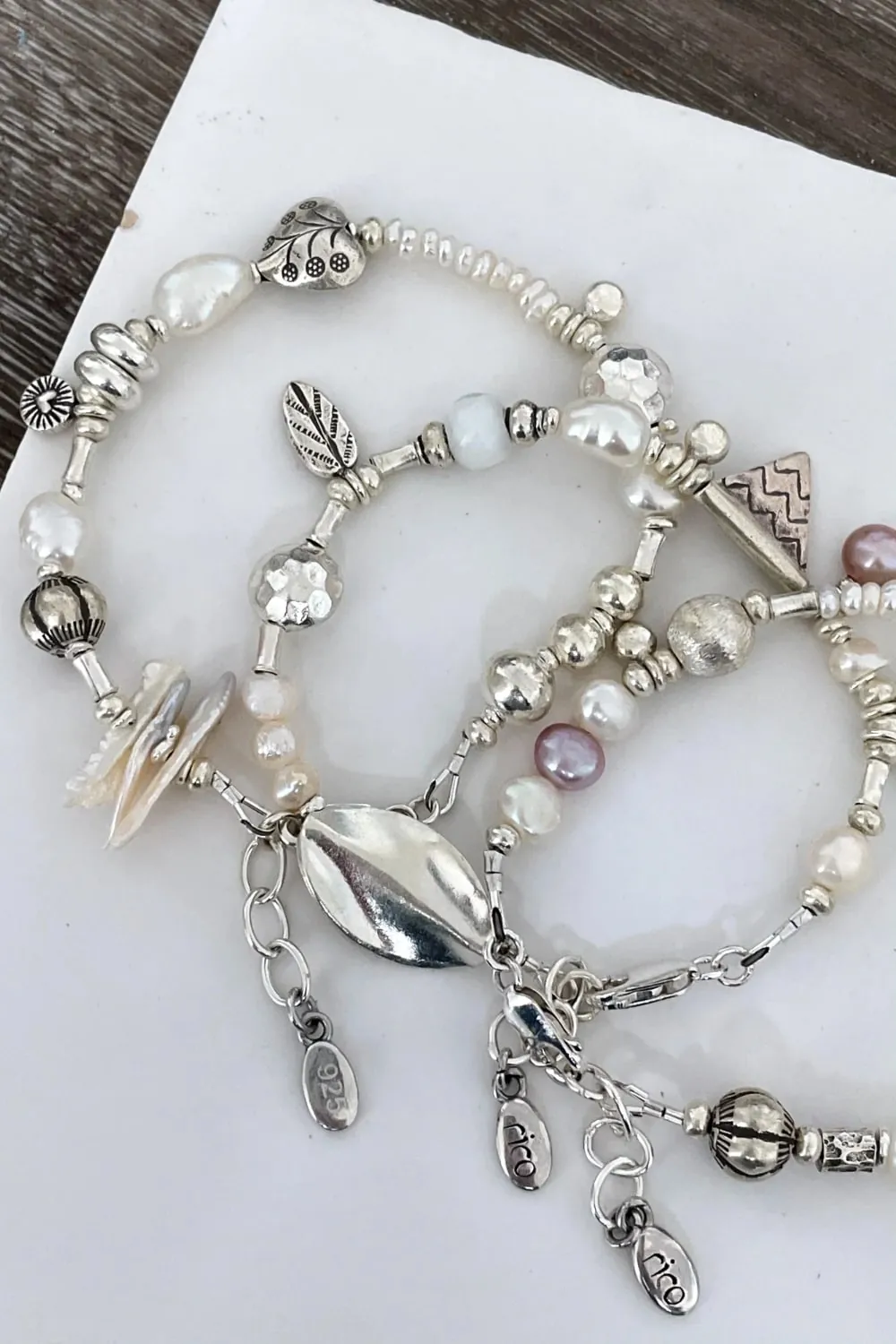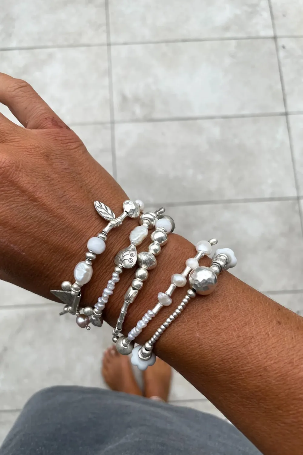 This piece is crafted with pure silver and strung on strong, flexible steel wire. While it can tolerate occasional water exposure, regular contact may cause the wire to corrode or weaken over time. For longevity, avoid water where possible and store in a dry, airtight container when not in use.