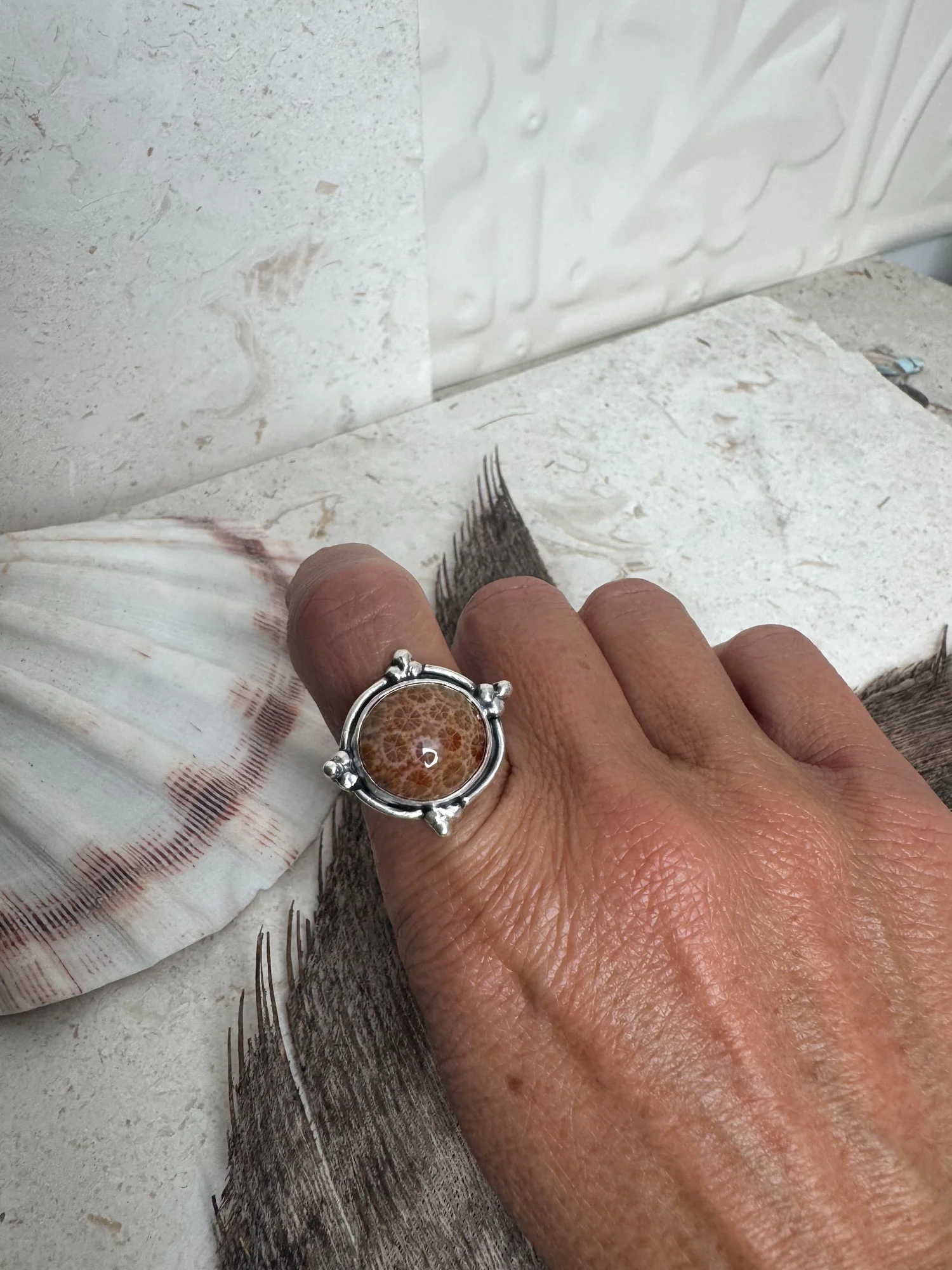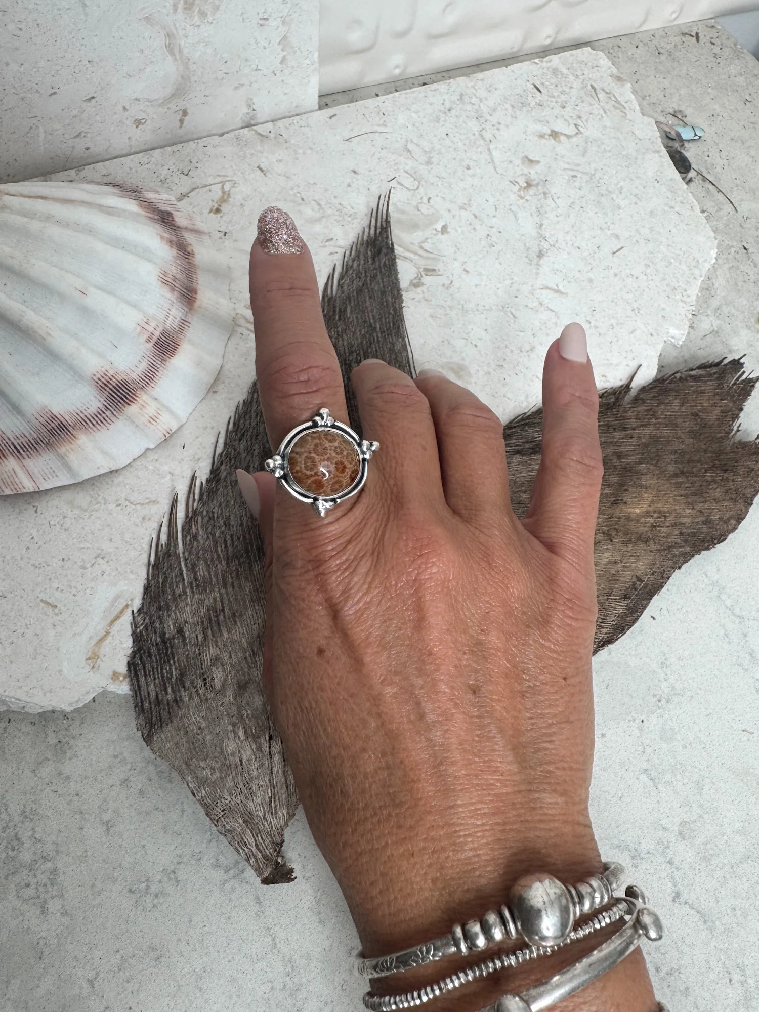 Crafted for the wild-hearted and ocean-bound, this one-of-a-kind statement ring captures the soul of the sea in a way only Rico can. Centred around a warm-toned fossilised coral, every natural detail in the stone tells a story millions of years in the making — a subtle nod to strength, grounding, and deep connection. Set in a handcrafted pure silver bezel with pure silver details, this ring is designed to be lived in. Whether you’re chasing saltwater or caught up in the chaos of motherhood, its bold yet earthy design is made to move with you — and made to last.