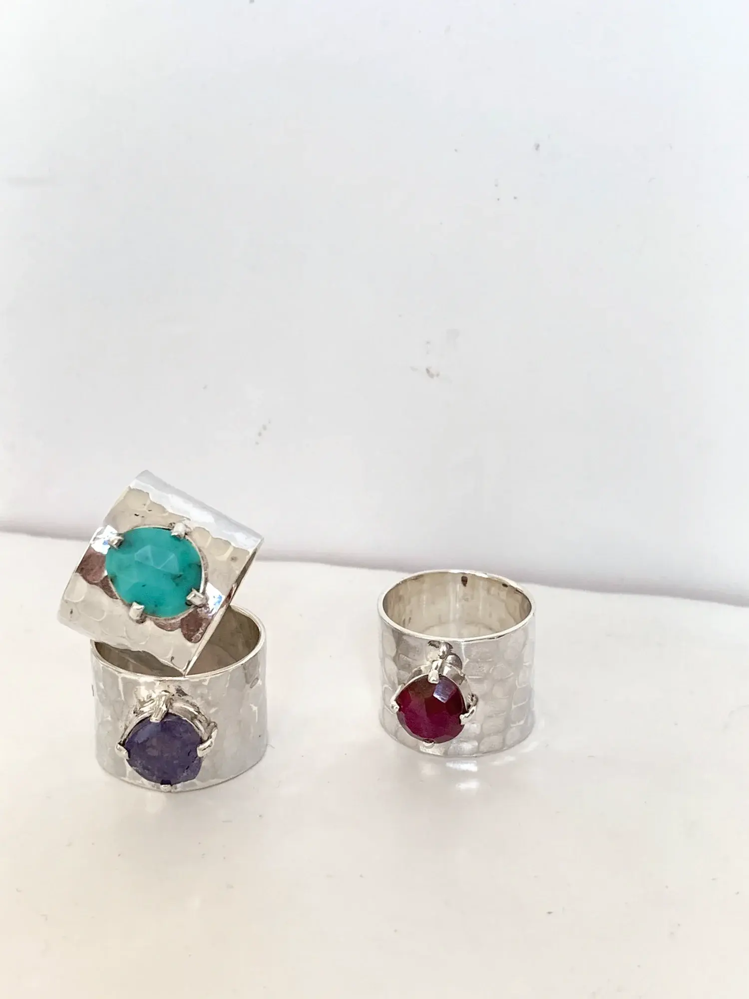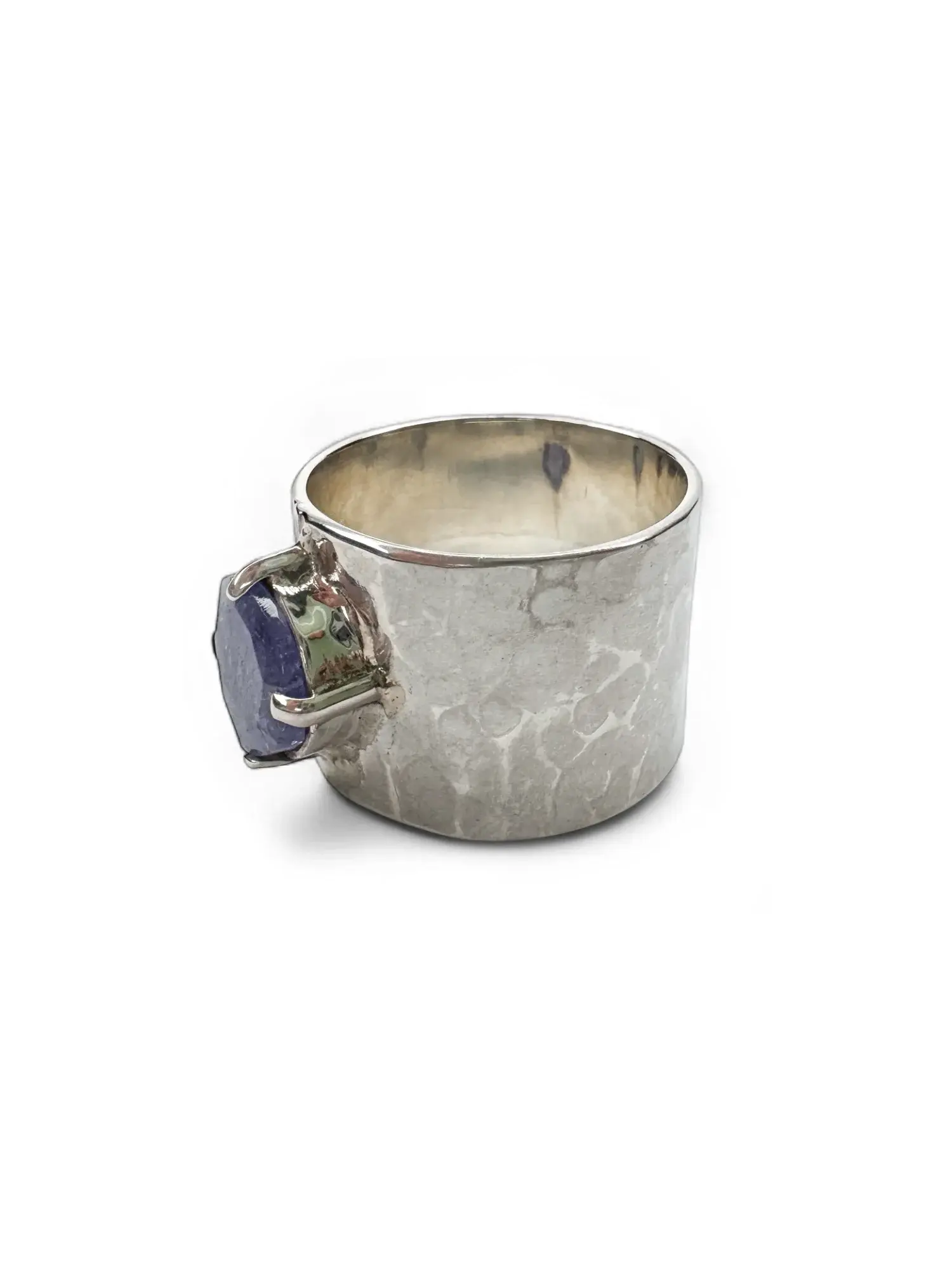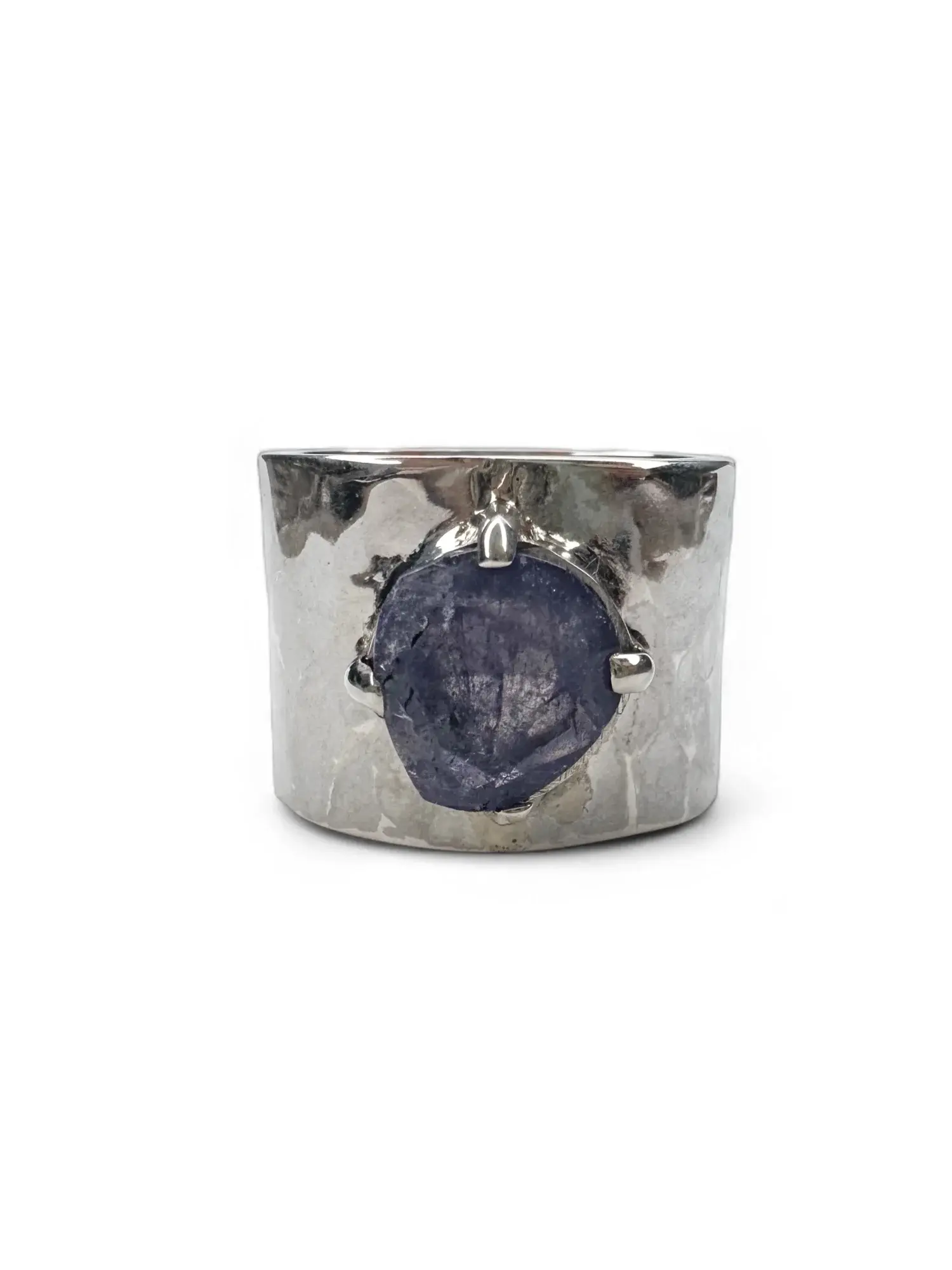 A stunning thick band hammered sterling silver ring featuring a rose cut purple Tanzanite gemstone in a claw setting.