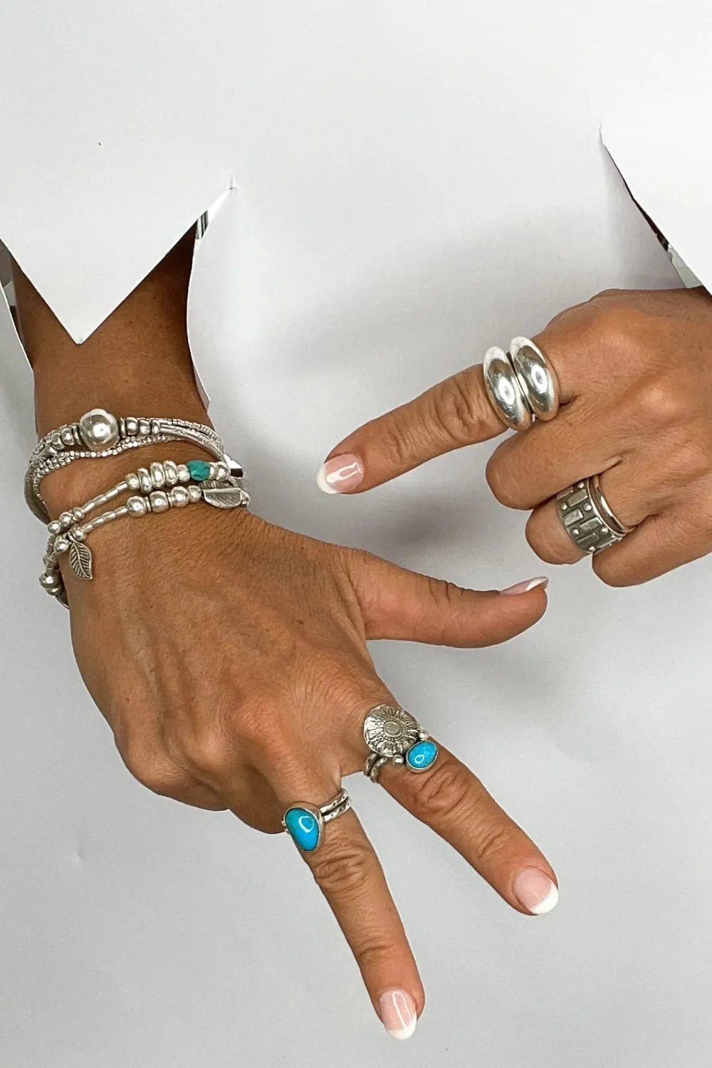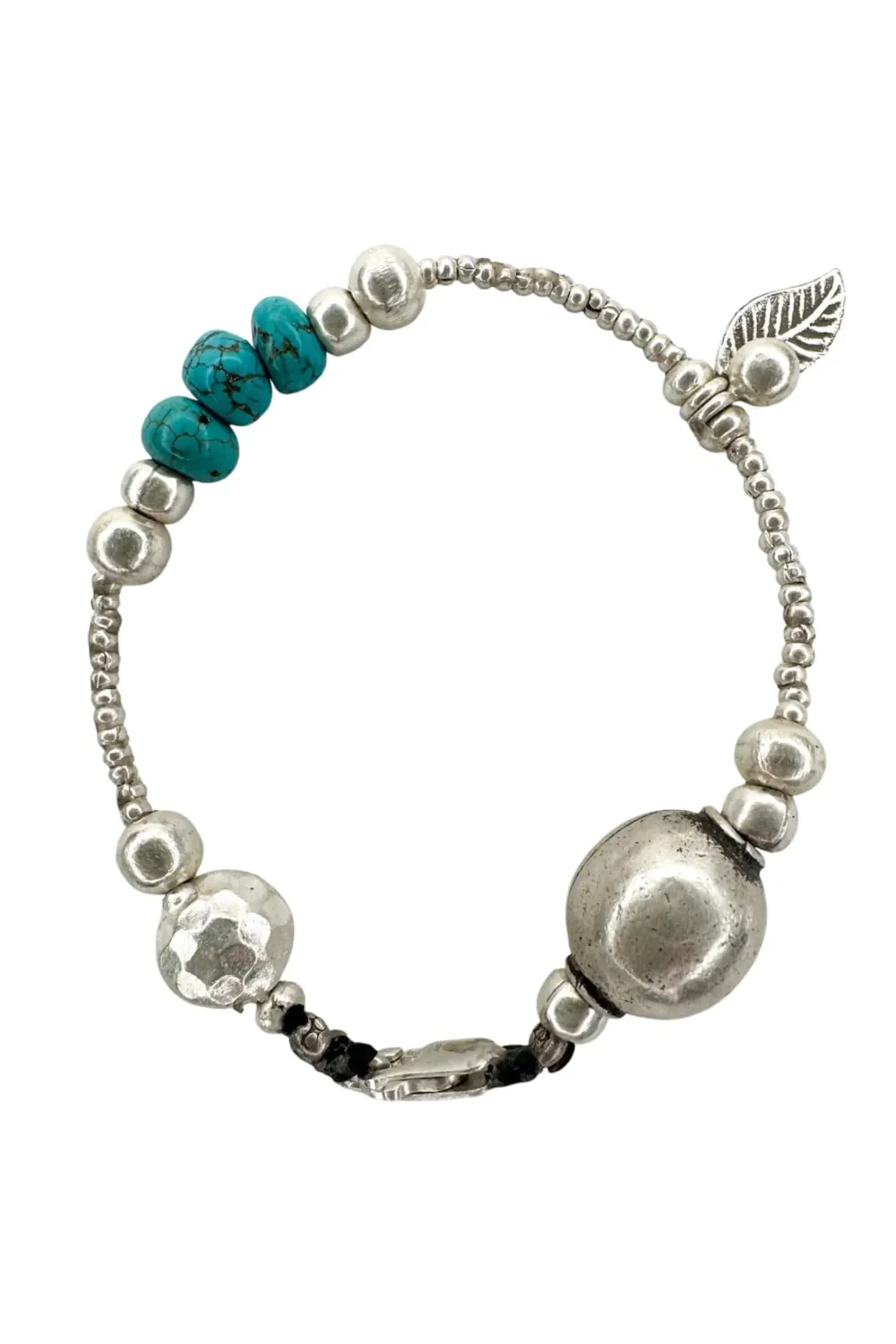 For all those turquoise lovers out there, this one is for you. A beautiful pure silver bracelet with a row of natural nugget turquoise gemstones to add a hit of colour to your bracelet stack. You won’t be able to resist falling in love with the Turquoise Island Silver Bracelet. It features an assortment of pure silver embellishments including a large silver domed barrel. Please note, Rico will try to keep the charms exactly as the product image but at times, may need to use slightly different charms. Please note that due to the natural nature of stones, variations will occur in colour, markings, size and shape.