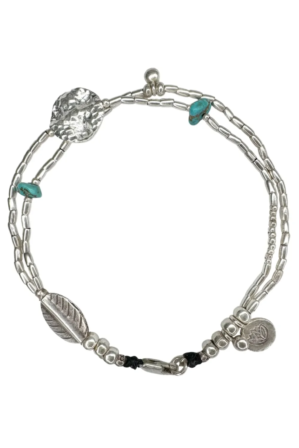 This doubled up style anklet is perfect to give that instant layering look. The Turquoise Double Silver Anklet features 2 pure silver strands of the classic Rico seed chain. This gathers into a pure silver toggle clasp connection with silver leaf tassel. The layers combine turquoise nuggets with a large flat silver disc, leaf and lotus flower pendant. Dress up a bikini or any beach outfit with effortless style this summer. It’s sure to become a favourite, you will feel naked without it.