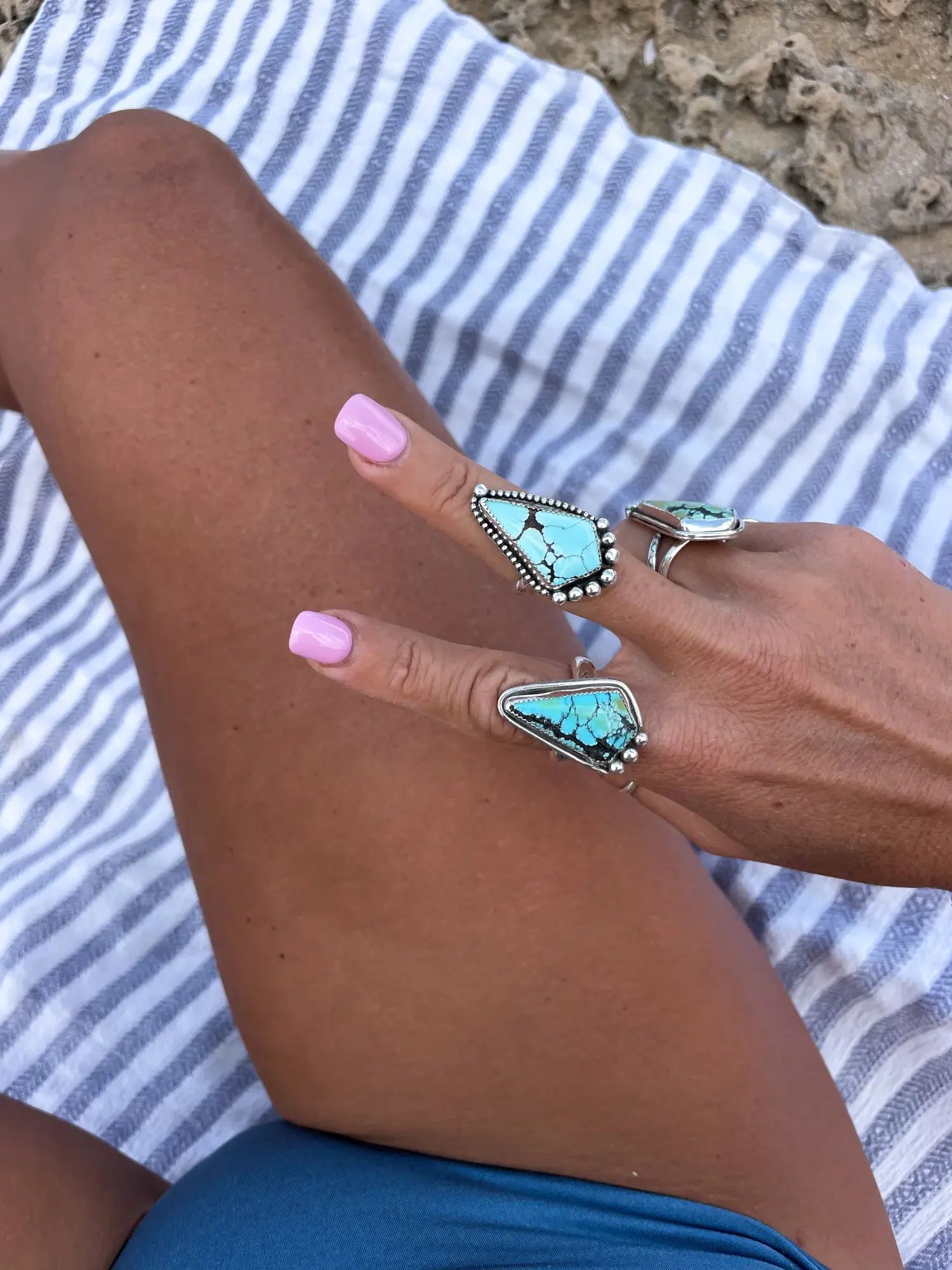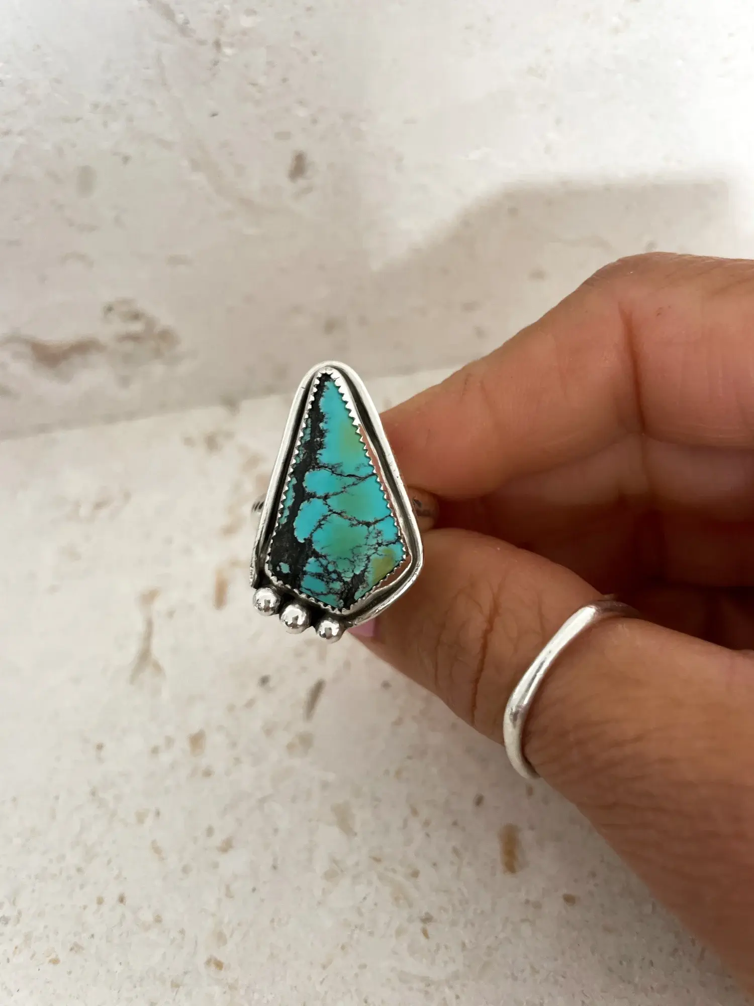 What a hunk of rock. This one is for all those big ring vibe lovers out there. A beautiful large Treasure Mountain Turquoise gemstone featuring blue/green/brown colours with black veining, it is truely unique. This handmade sterling silver ring features a stunning Treasure Mountain Turquoise shield shape gemstone set by a serrated edge bezel and surrounded by wire and 3 ball design. It sits on top of a heavy gauge solid sterling silver ring shank.