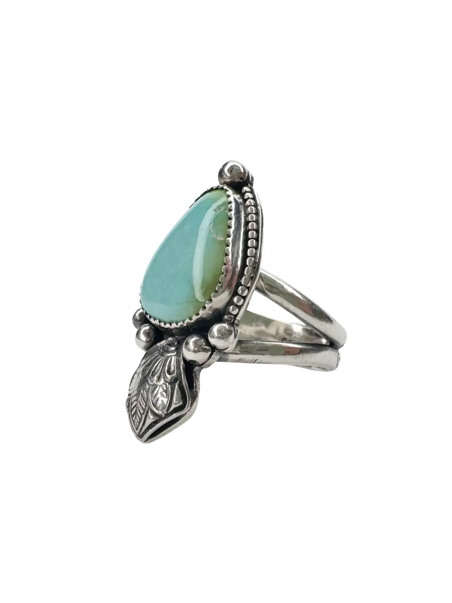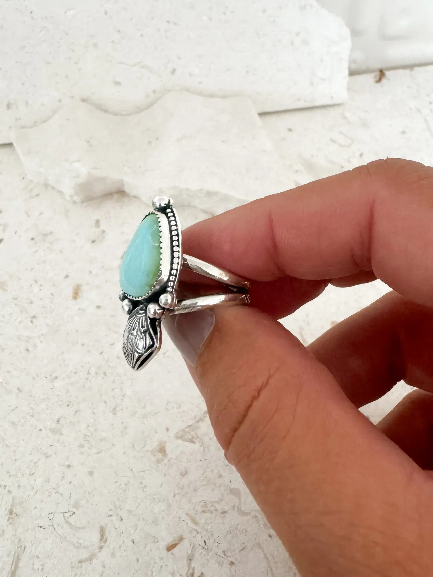 Get lost in these dreamy blues. A beautiful one of sterling silver ring with hand etched sterling silver tail detail. This sterling silver ring is a definitely show stopper! It is set with a minimal sterling silver bezel and ball design setting. It is finished on a lightly hand stamped sterling silver double rings shank.
