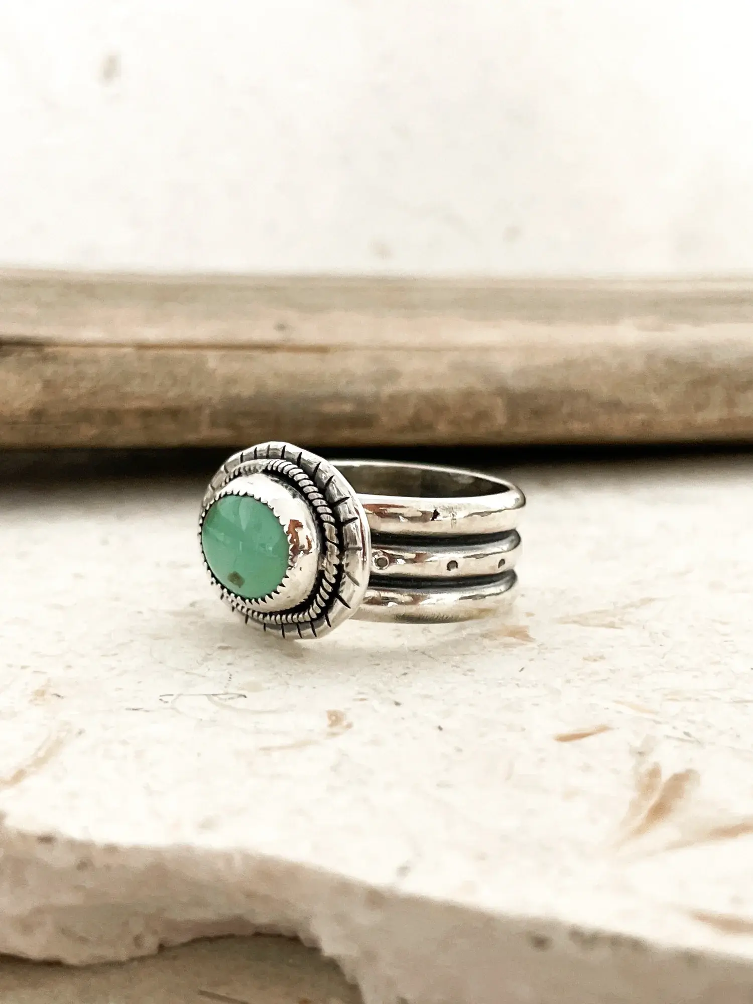 A beautiful handmade sterling silver ring with a stunning green New Lander Variscite gemstone. Surrounded by a sterling silver freeform cut disk with rope detailing and serrated edge bezel + hand stamped surface. It sits on a thick triple band sterling silver ring shank which has hand forged markings at its centre. The beauty of this ring shank is it makes it look like you have a ring stack of 3 rings.