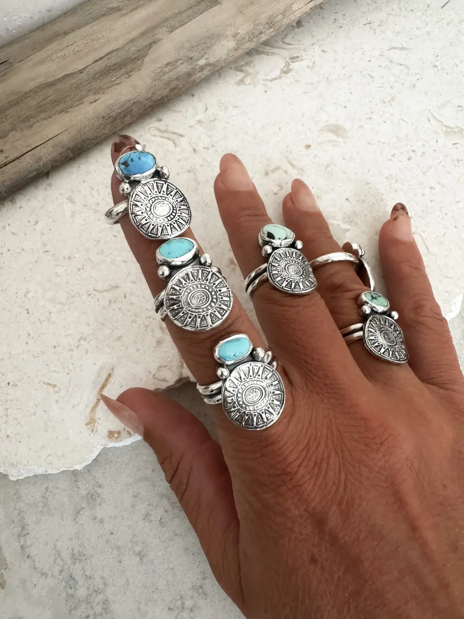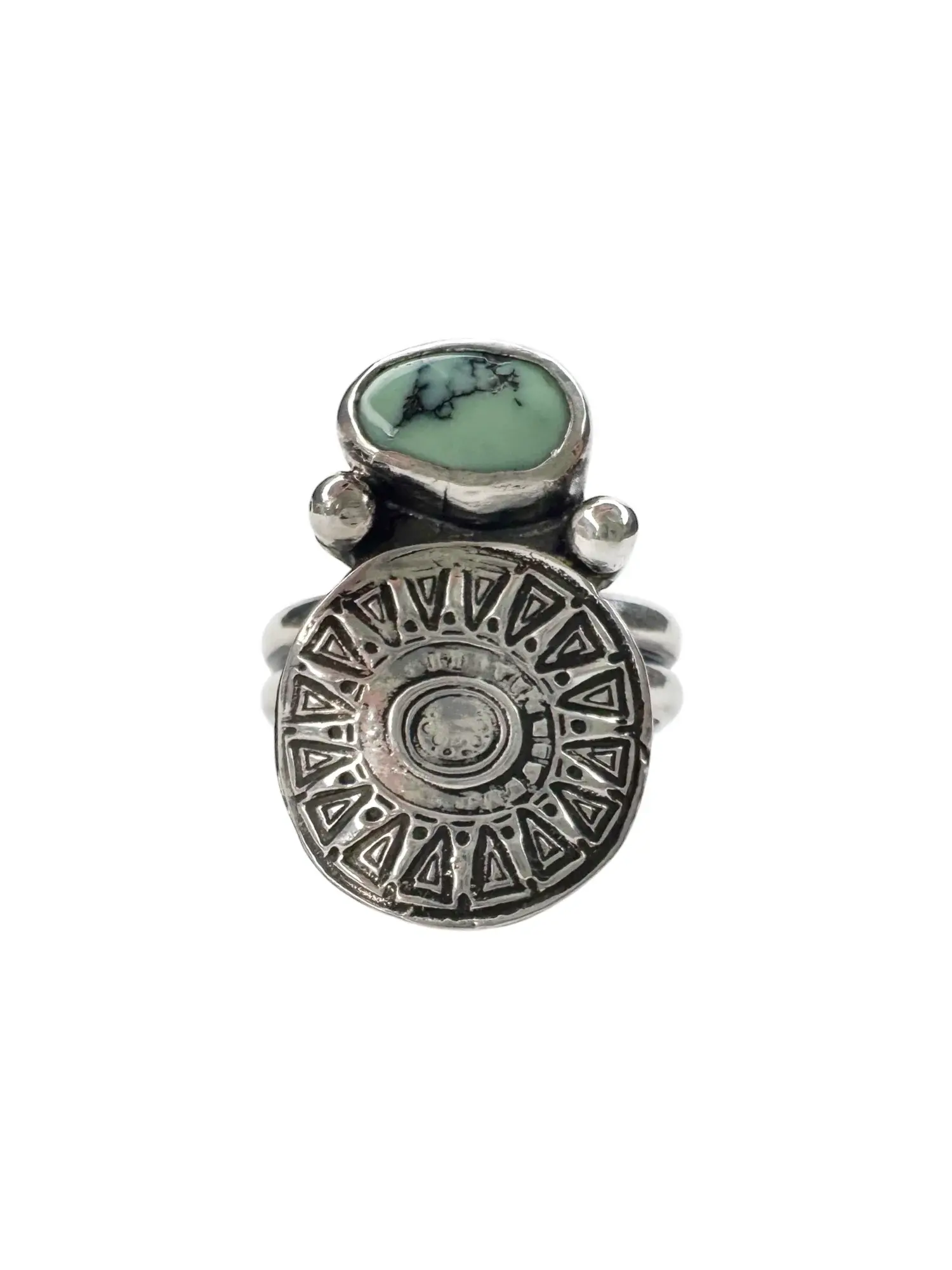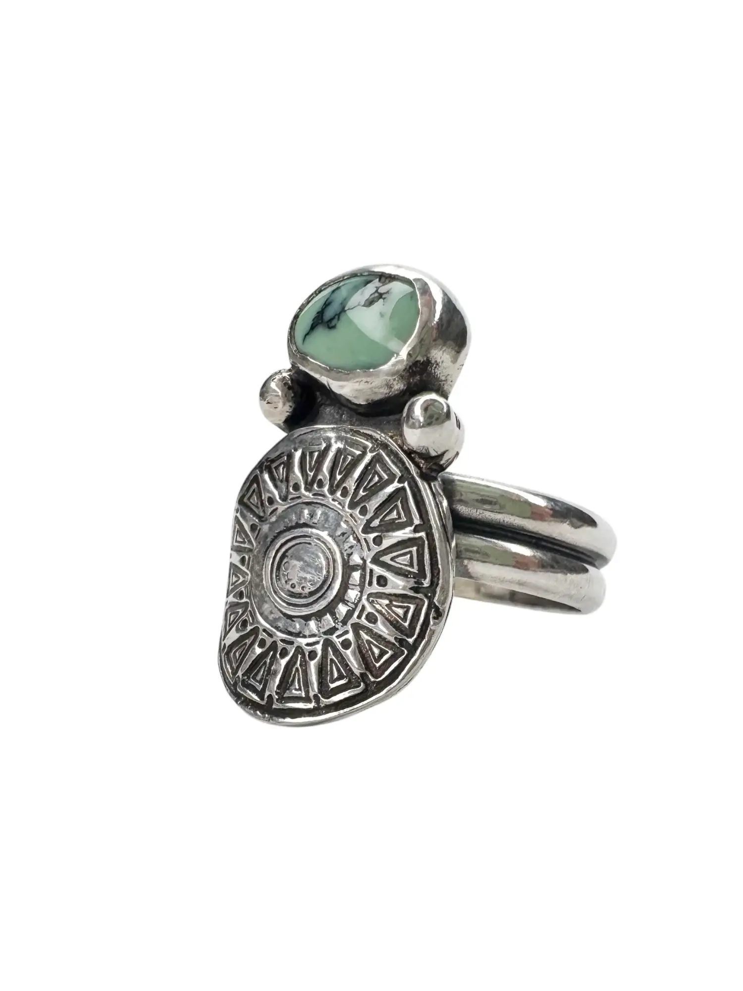 A beautiful one off sterling silver ring featuring a beautiful free form Natural Prince Variscite. it is set above a hand cut and stamped sterling silver disc which curves to the shape of the finger. It sits on a sterling silver double band ring shank. Wear this beauty solo or stack it up with simple bands. This sterling silver ring is a show stopper.