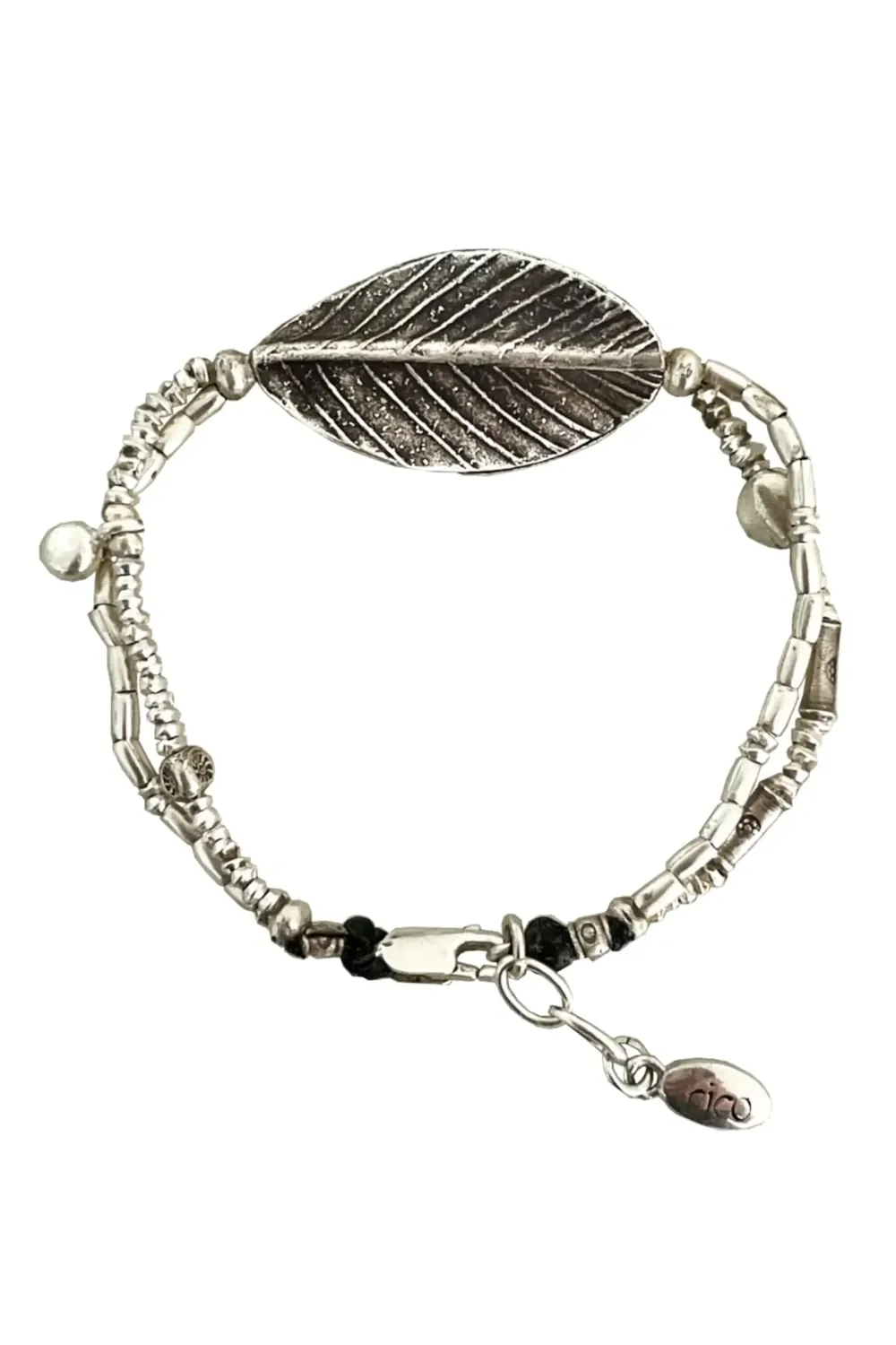 A beautiful pure silver bracelet featuring pure silver charms and a large central warped leaf all combined on a double strand silver design.