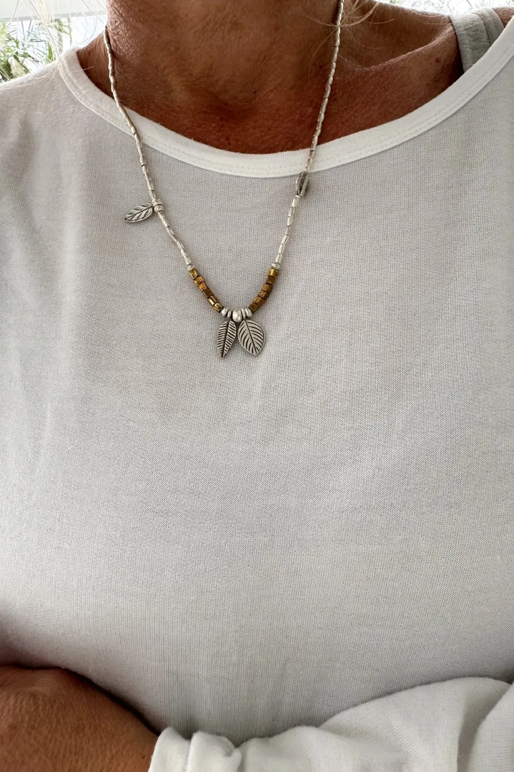Pure silver wrap bracelet with pure silver 2 leaf detail centre surrounded by bronzed colour seed beads. Wear it as a triple wrap bracelet, a double anklet or a necklace.