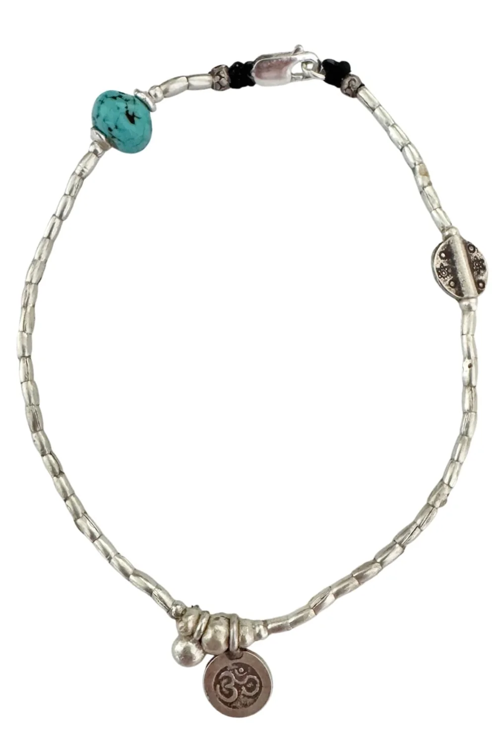 A beautiful pure silver single strand anklet featuring a central silver Om round pendant plus a beautiful single light blue howlite stone. Dress up a bikini with effortless style this this summer. You will feel naked without it.
